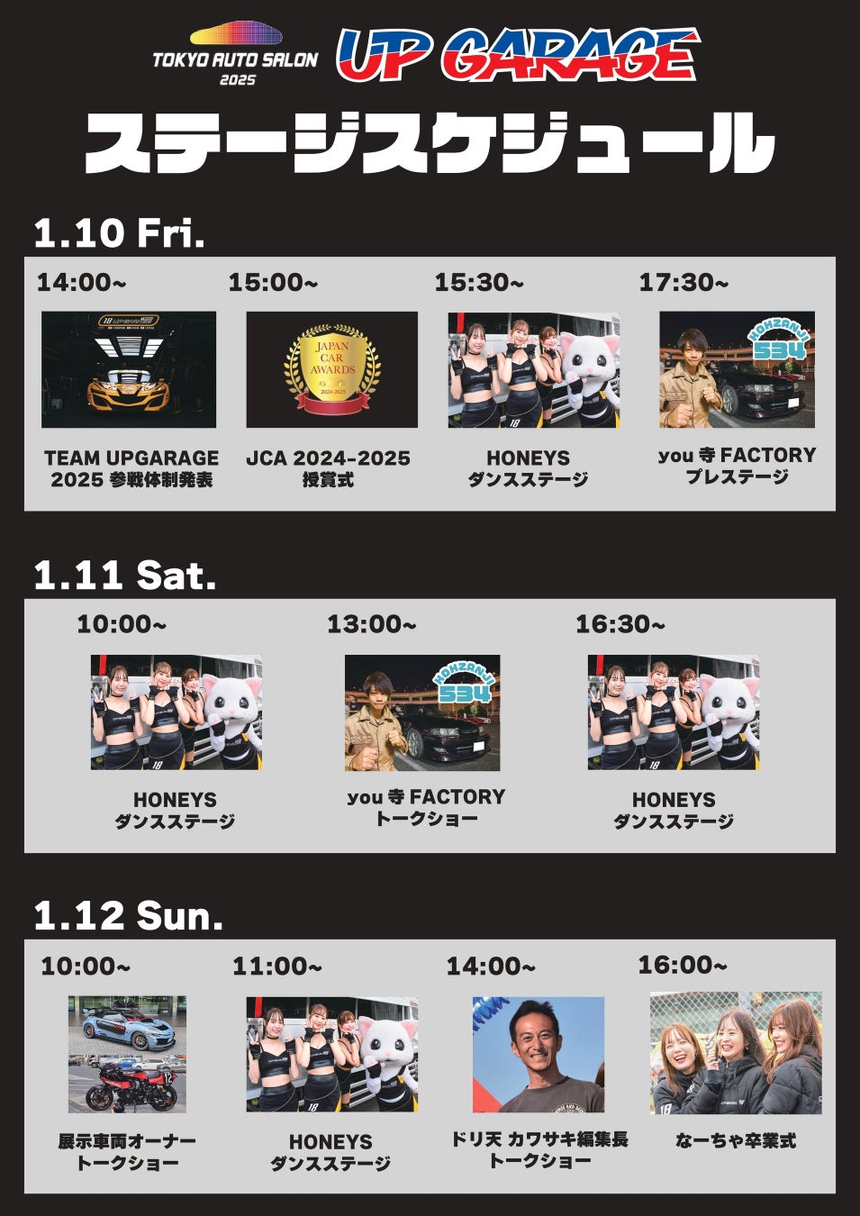 さらに、ステージではTEAM UPGARAGE参戦体制発表のほかにも、JAPAN CAR AWARDS表彰式、TEAM UPGARAGE HONEYSのダンスステージや大人気YouTuber「you寺FACTORY【ドリフト僧侶】」さん、そして、ドリ天 カワサキ編集長のトークショーを実施します。