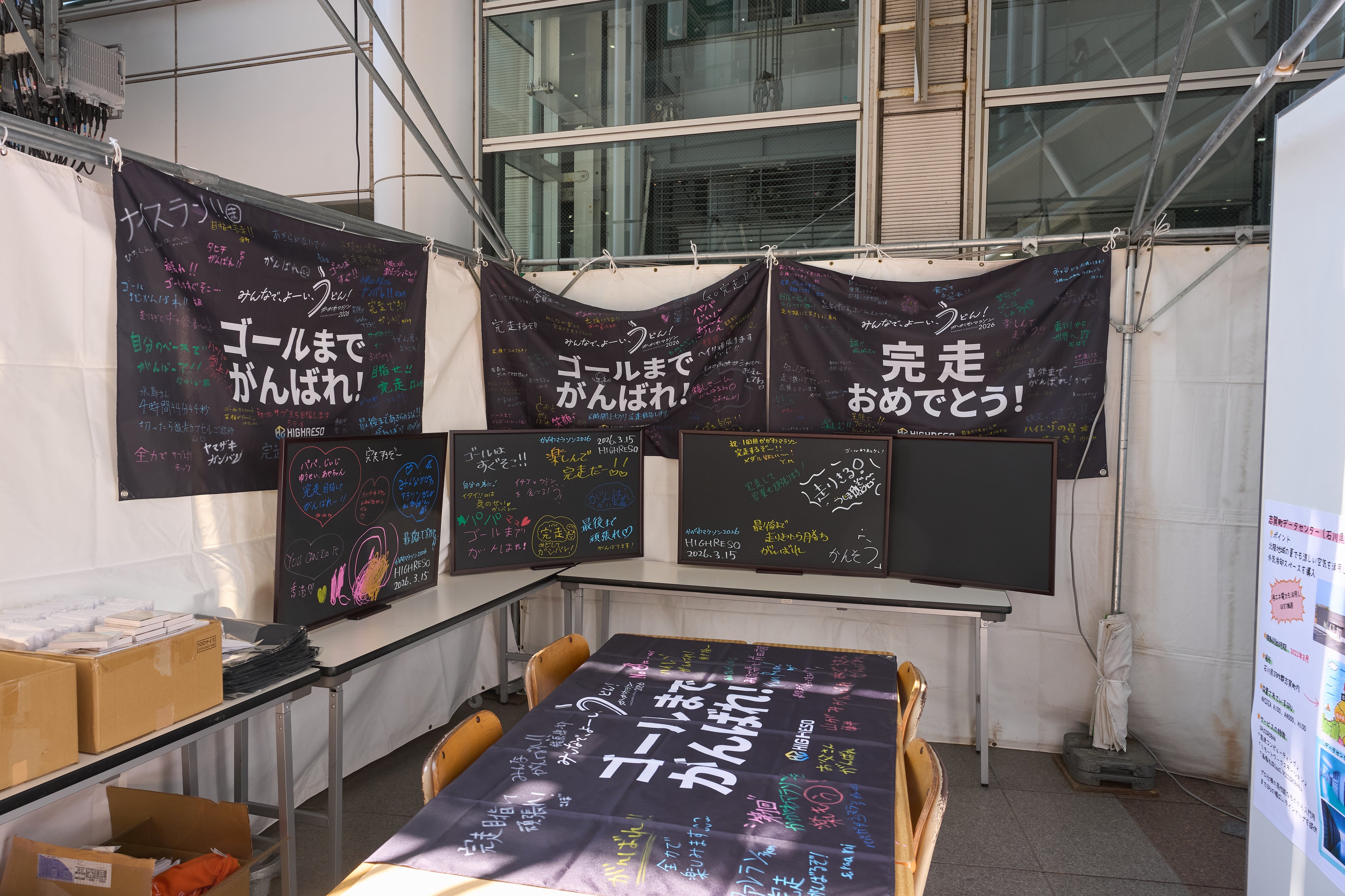 ブースでは当社のAIデータセンター事業の紹介に加え、ランナーへの応援メッセージを寄せ書きできる横断幕コーナーや、完走ランナーが撮影できるフォトスポット、さらにオリジナルグッズが当たるカプセルトイなど、さまざまな参加型アクティビティを実施しました。