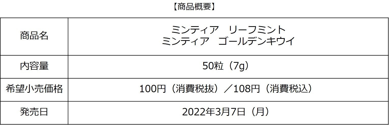 そこで今回、甘いものを食べたあとのお口直しとして『ミンティア リーフミント』、手軽にフルーツのリアルな甘さや食べ応えを楽しめる商品として『ミンティア ゴールデンキウイ』を新発売することで、新たな生活様式下でのリフレッシュニーズの変化に対応していきます。