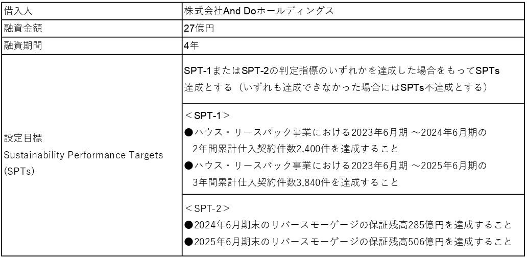 ハウスドゥブランドで不動産事業を全国展開する株式会社And Do ホールディングス(本社:東京都千代田区、代表取締役社長 CEO:安藤正弘、以下:当社)は、オリックス銀行株式会社(本店:東京都港区、代表取締役社長:錦織雄一、以下:同行)と「サステナビリティ・リンク・ローン」(以下:SLL)について融資契約を締結し、このたび実行されたことをお知らせいたします。