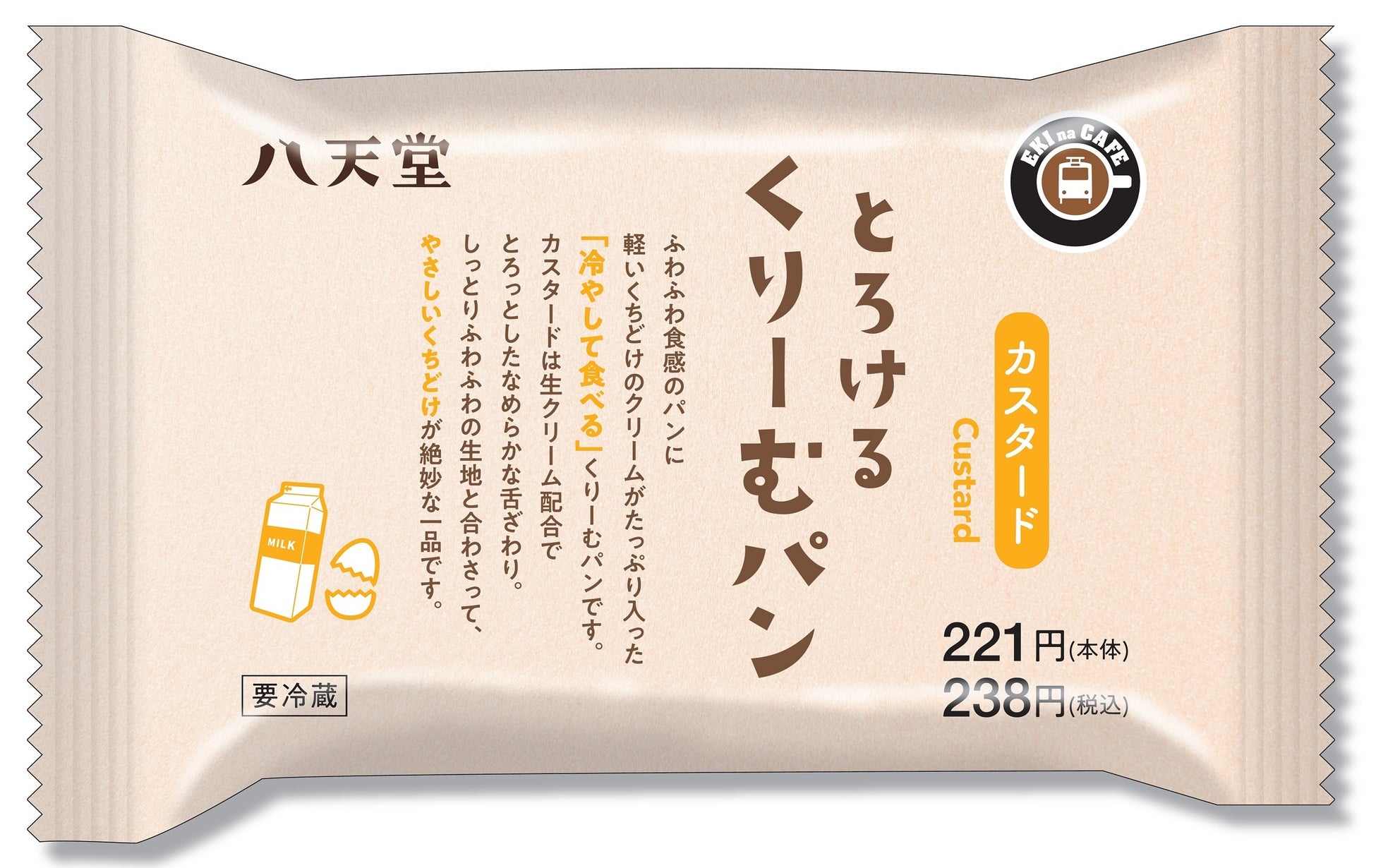 「とろけるくりーむパン 北海道ミルク」は、しっとりふんわり柔らかな生地の中に、北海道産生乳100%の牛乳で作ったミルクカスタードと、ホイップクリームを混ぜ合わせた特製ミルククリームを入れています。「EKI na CAFE(エキナカフェ)」ブランドロゴと、北海道の地図が目を引くパッケージが目印です。