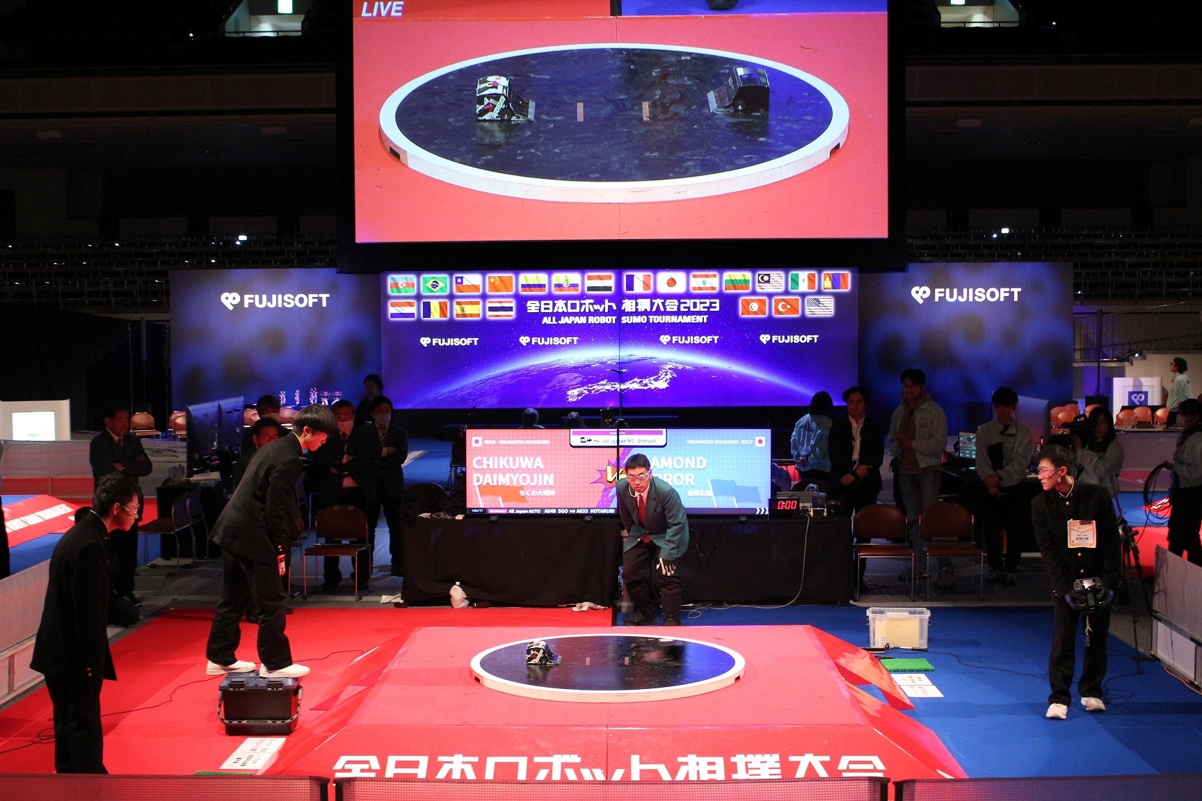 「全日本ロボット相撲大会」は、ロボット作りを通して「ものづくり」の楽しさを知ってもらう場を提供することを目的に、1989年より富士ソフト株式会社が開催しているロボット競技大会です。ロボット相撲は、参加者が自作したロボットを力士に見立てて、技術とアイデアで相手を土俵から押し出すことで勝負が決まります。