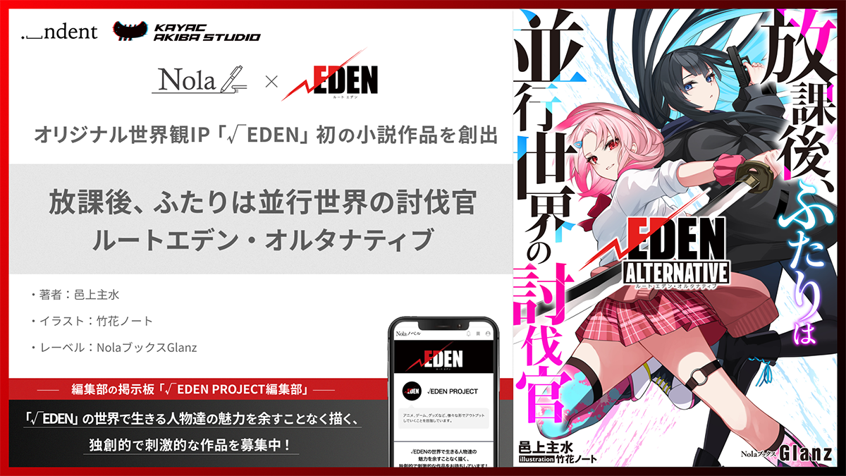 indentが運営する小説投稿サイト「Nolaノベル」内「編集部の掲示板」の原作募集ページ「√EDEN PROJECT編集部」では、「√EDEN」の世界で生きる人物達の魅力を余すことなく描く、独創的で刺激的な作品の募集を引き続き受け付けています。indentとカヤックアキバスタジオは、今後も小説作品供給の連携を強化し、次世代の人気IPの創出を目指すとともに、日本における創作市場のさらなる発展と活性化に寄与してまいります。