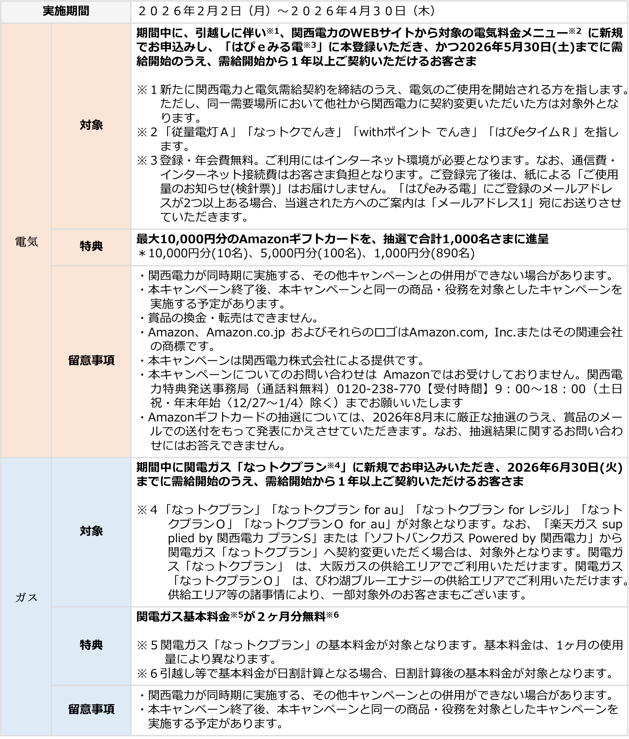 当社は、新生活を迎えるお客さまに関西電力の「電気」と「ガス」をお選びいただけるように、2026年2月2日(月)から2026年4月30日(木)までの3ヶ月間、「引越すなら、電気もガスも関西電力!キャンペーン」と題して、電気とガスのキャンペーンを実施いたします。