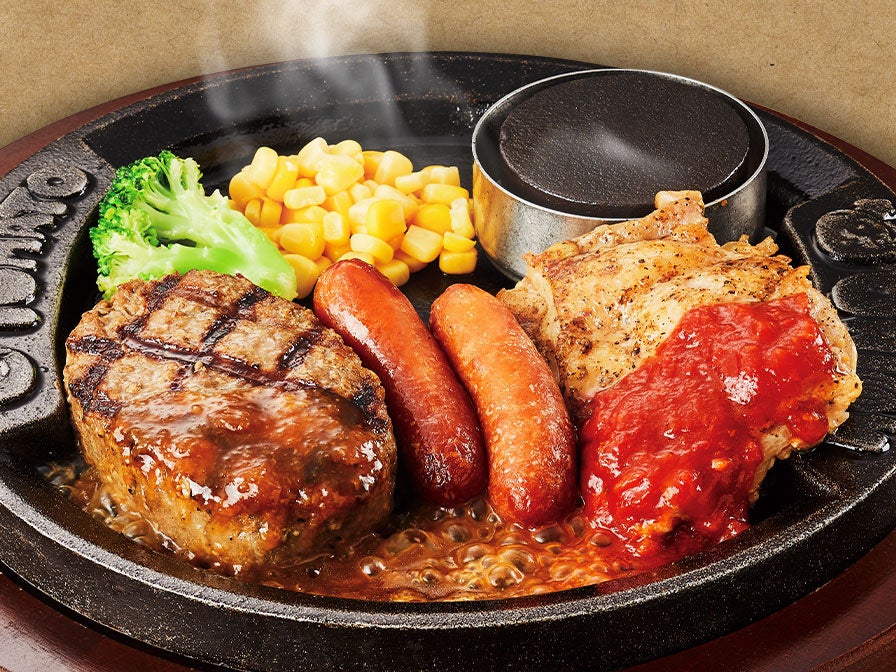 ハンバーグ、ソーセージ、グリルチキンを一度に楽しむことができます。