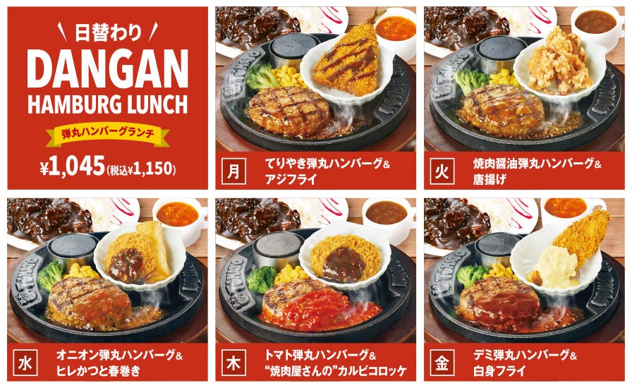 当店名物「“牛肉100%!!”弾丸ハンバーグ」のメニューのバリエーションが増え、様々な食べ方でお楽しみいただだけます。他に、和食メニューの充実やサイドメニューが新たに登場いたしました。また、名物「“牛肉100%!!”弾丸ハンバーグ」が日替わりランチメニューに初登場いたします。ランチタイムはお得にお召し上がりいただくことができます。