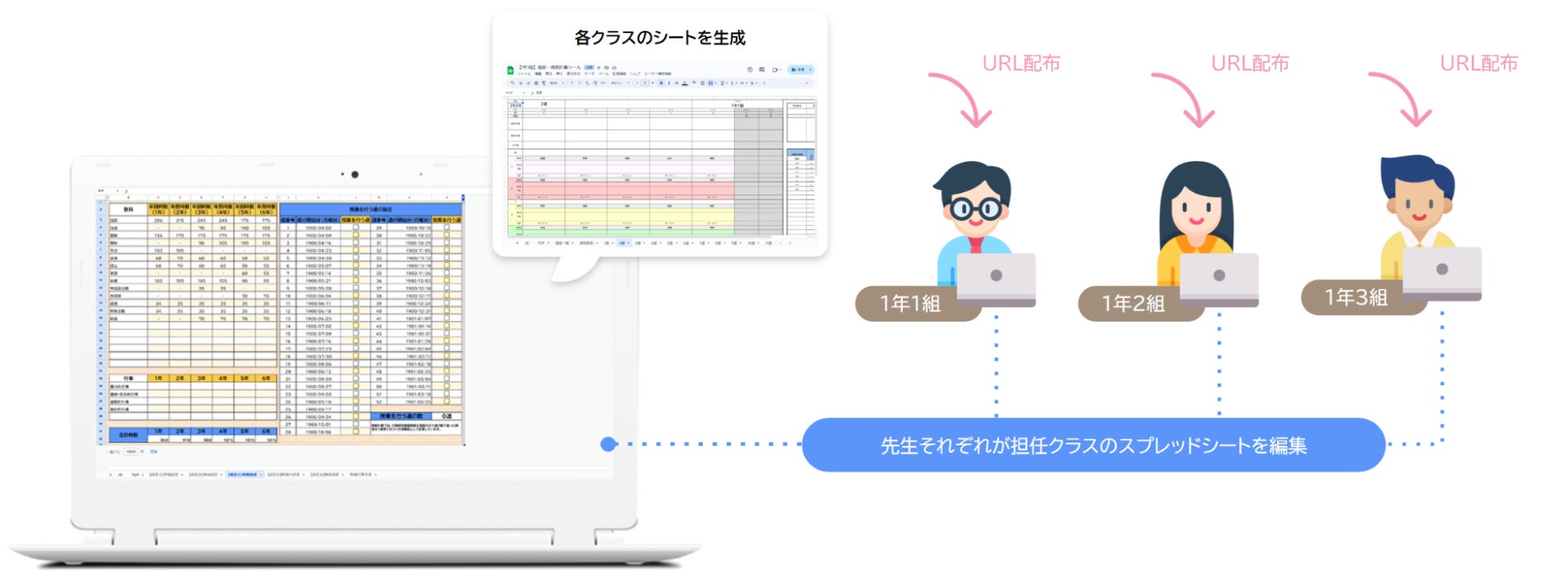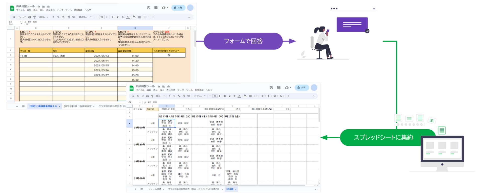 専用の スプレッドシート 上で、面談の日程調査用フォームを作成し、回答結果を表形式で表示するツールです。回答結果が従来のフォームより見やすく整理されており、クラスの状況に合わせた効率的なスケジュール調整を支援します。