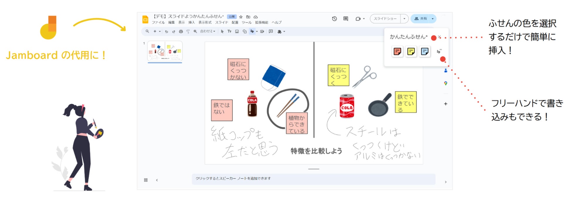 本ツールは、スライド 用の拡張機能です。Jamboard のように、スライド上に簡単にふせんを貼ることができます。小学校低学年でも直感的に操作でき、 子供たちが自由にアイデアを書き込み、動かしながら思考を深められるので、創造性を育む学習に最適です。