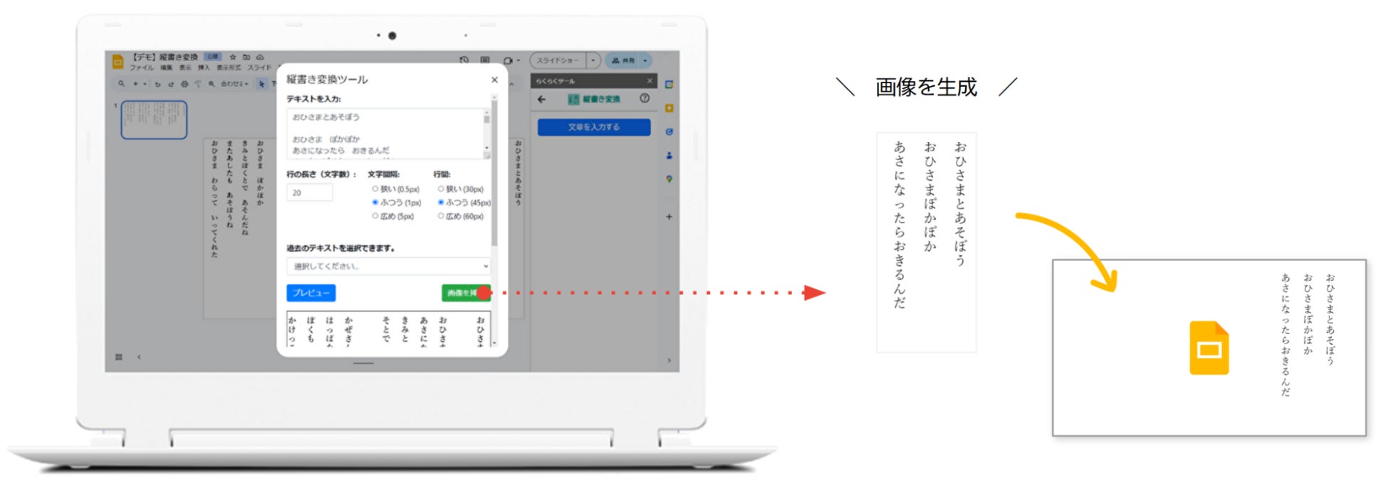 本ツールは、「縦書き」の機能を スライド で実現しました。縦書きにしたい文章を入力し、縦書きの画像として生成します。生成した縦書き画像はスライド上で自由に配置できます。