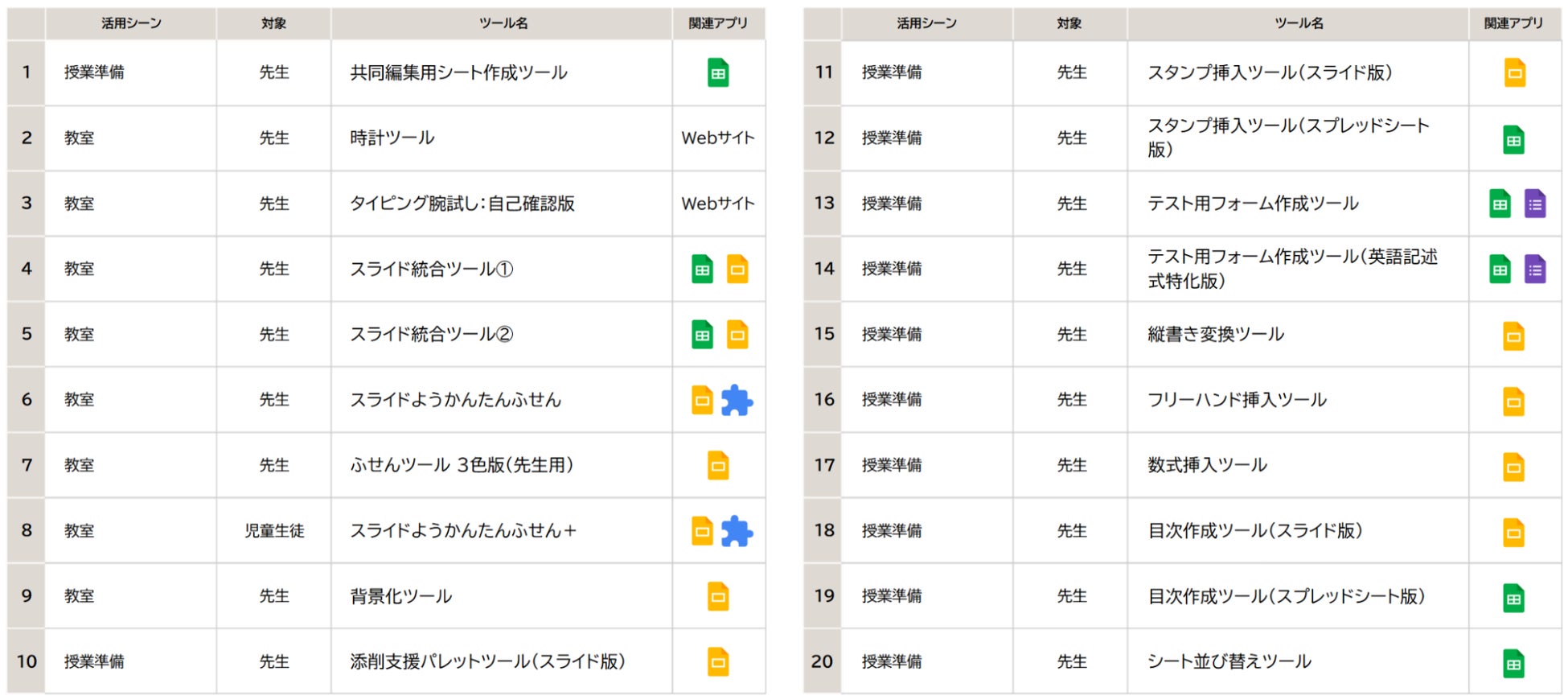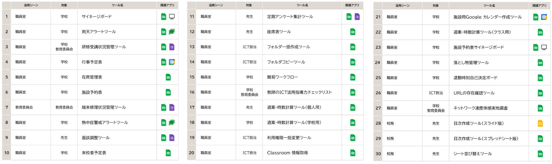 『らくらく先生ツール』は、Google を活用して校務のDXを支援するソリューションです。Google のツールをさらに便利にし、「あったらいいな」「できたらいいな」を実現します。職員室や校務で利用できる30種類のDXツールを用意しており、これらのツールを活用することによって各クラスの週案を学校で1つに集約して一元管理できたり、クラス全員分の面談希望日程を簡単に調整し、一覧で見やすく表示したりすることなどができるようになります。