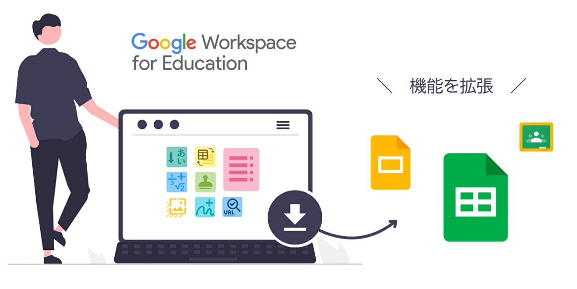 『らくらく授業ツール』は、同様に学びのDXを支援するソリューションです。Google Jamboard™ のように Google スライド™ 上に簡単にふせんを貼ることができる機能や、スライド で「縦書き」ができるようになる機能など、授業等で活用できる20種類のDXツールを厳選して拡張することができます。
