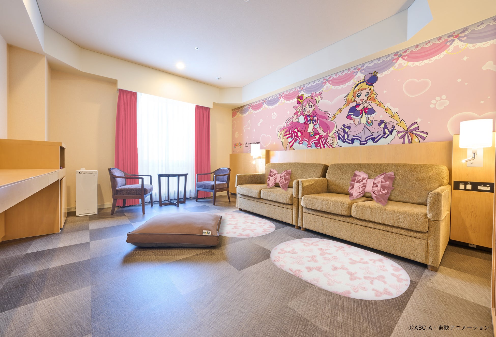 キュアワンダフルとキュアフレンディがお部屋でお出迎え。愛犬がリビングと同じようにのびのびと遊ぶことができ、就寝時にベッドになるソファを配した「inumoルーム」をベースとしており、お部屋で愛犬と一緒に「わんだふるぷりきゅあ!」の世界をお楽しみいただけます。