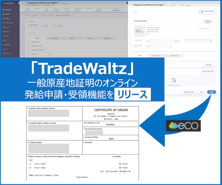 貿易情報連携プラットフォーム「TradeWaltz®︎」を運営する株式会社トレードワルツ(以下:トレードワルツ)は、輸出者向けに2024年5月末から日本商工会議所と連携した「一般原産地証明書」のオンライン発給申請・受領機能をリリースしました。同機能は入力済の契約情報や通関手配情報などをもとにWeb上でスムーズかつリモートに使える機能で、1stユーザーとして豊田通商株式会社(以下:豊田通商)が名古屋商工会議所の協力のもとパイロット運用を開始しています。