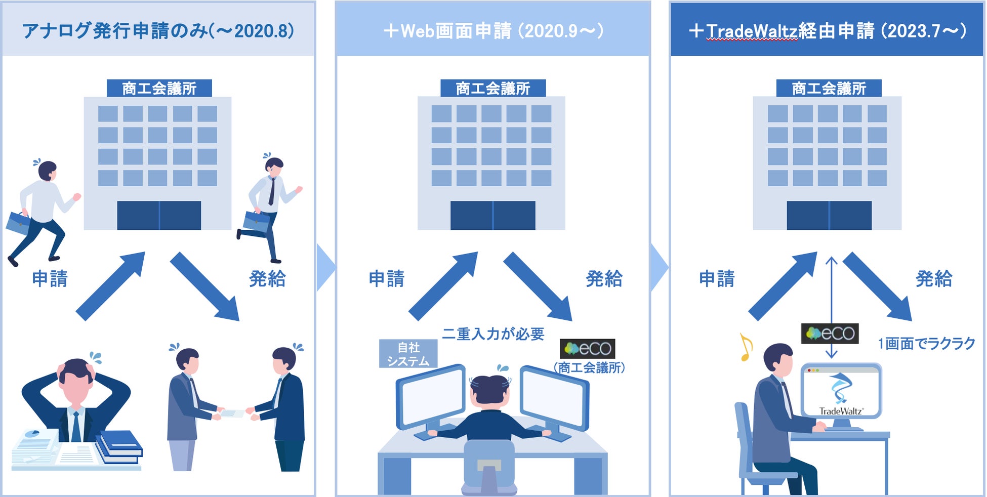 今回構築したTradeWaltz経由での「一般原産地証明書」の発給申請・受領の機能については、既に豊田通商と名古屋商工会議所との間でパイロット運用を開始しております。運用状況を確認後、日本商工会議所や各地商工会議所とご相談しつつ、今後名古屋地域での利用企業の拡大や、各地商工会議所への展開も検討しております 。