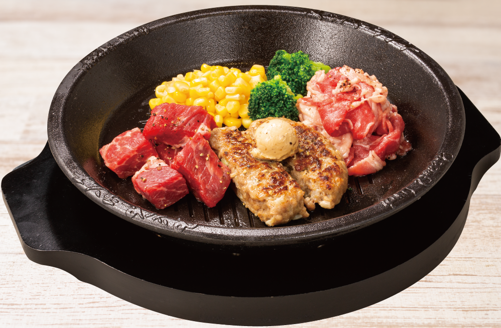 毎月29日は“肉の日”!ハンバーグ、ステーキ、牛焼肉がワンプレートで楽しめるよくばりメニューがお得!