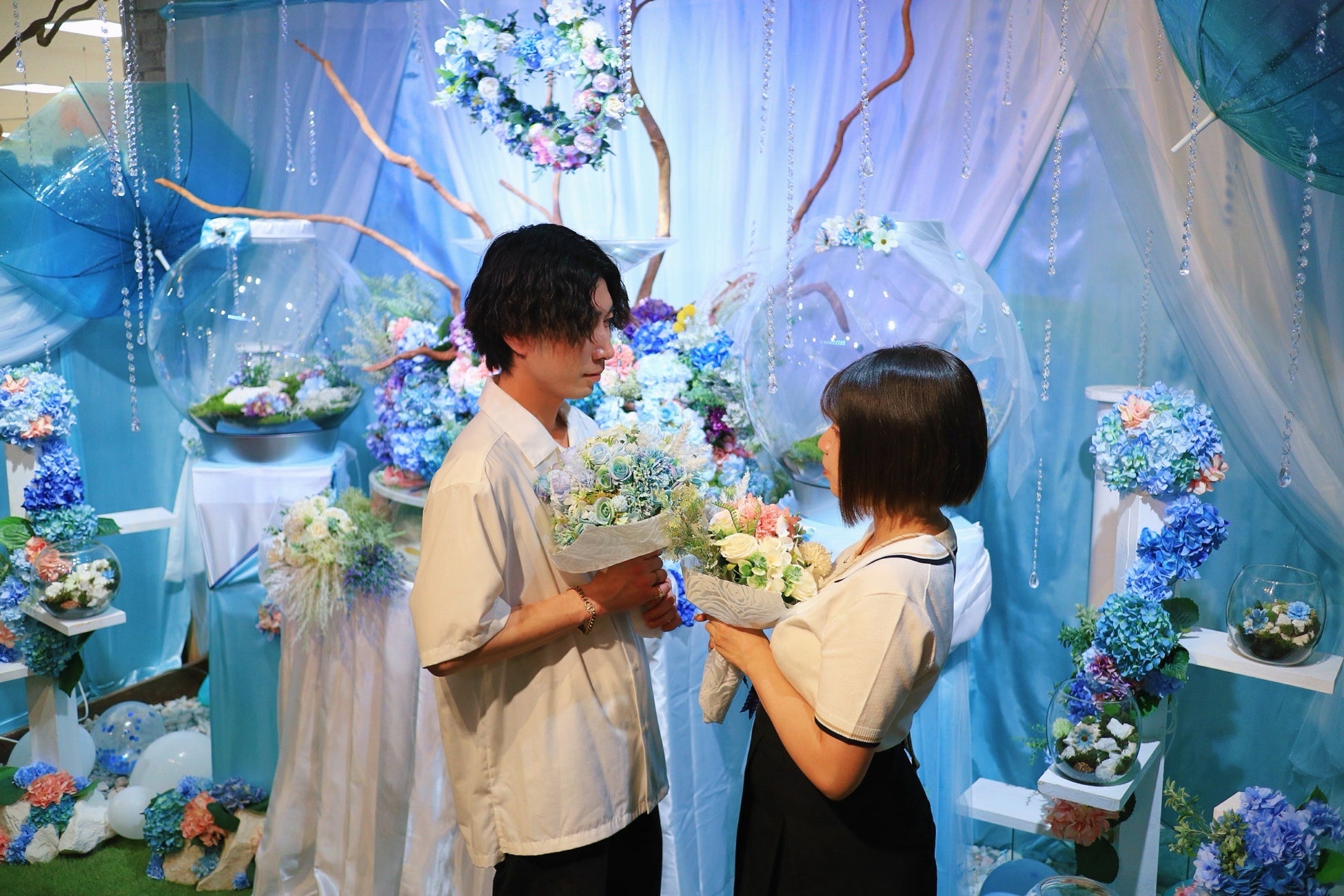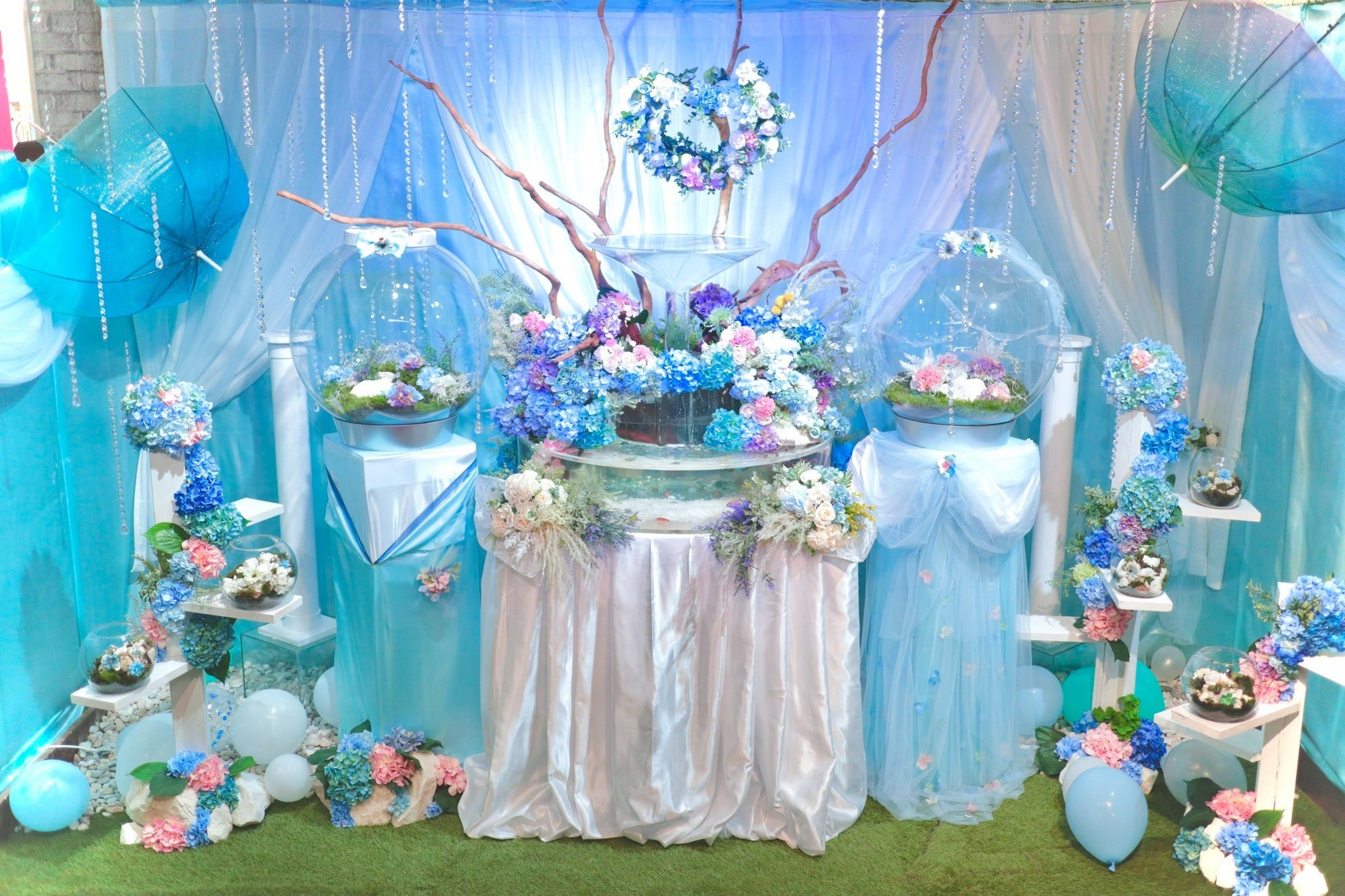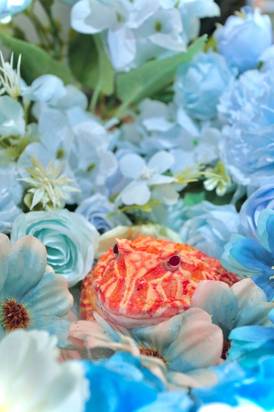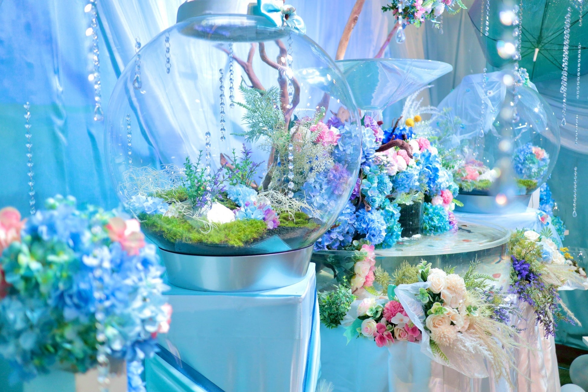 本展示は、「6月6日=カエルの日」と「ジューンブライド」の語呂と季節性をかけ合わせた、カエルたちの“結婚式”をテーマとした展示企画です。館内には、シャンパンタワーをモチーフとした「シャンパン水槽」を中心に、バイオープやグラステラリウム、小型水槽6本を配置。ツノガエルやアマガエルなど、個性豊かなカエルたちを、青や紫を基調とした花材とともに展示します。