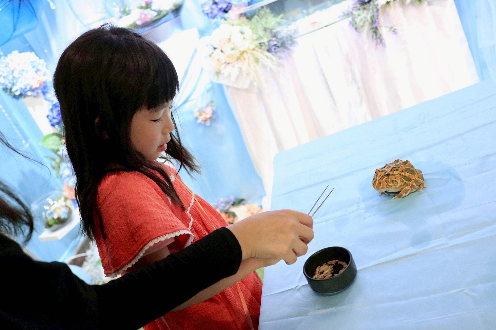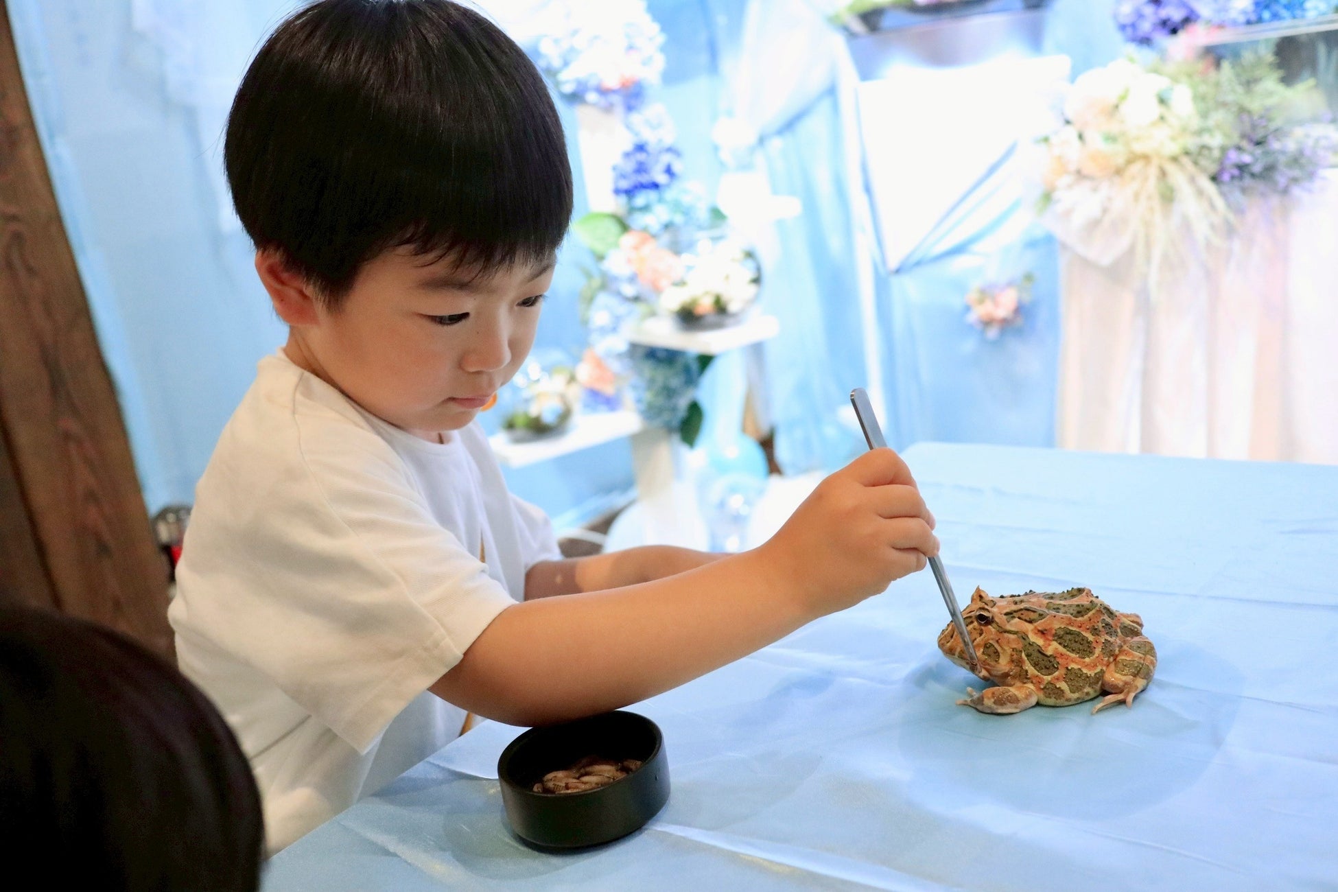 人気のカエルたちに実際に餌をあげられる、数量限定の体験イベントを火曜日・金曜日の14時〜実施。