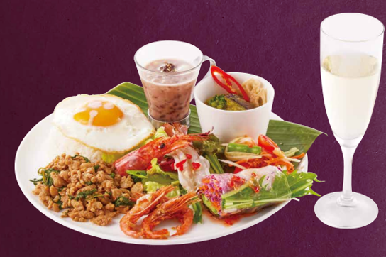 タイ料理の人気メニューに加え、お正月のお祝い料理にぴったりでタイ料理でも良く使われるエビを3種類の調理法でご用意しました。タピオカココナッツミルクにあずきと白玉、そして金箔をあしらいスパークリングワインをセットにしたお正月限定スペシャルプレートです。
