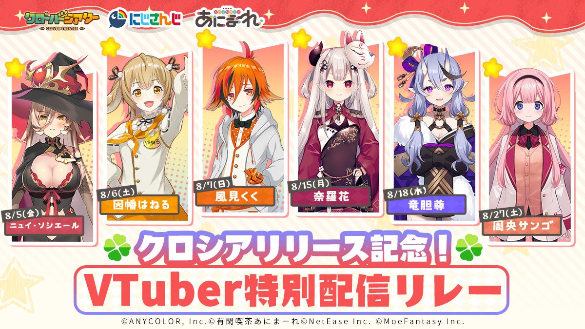 『クローバーシアター』正式リリースを記念して、8月5日から、にじさんじと有閑喫茶あにまーれの超人気ライバーたちがリレー形式でクロシアに挑戦! 絶対に見逃せない配信リレーを是非お楽しみに!