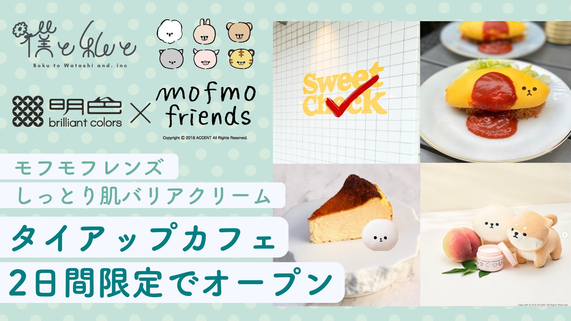 Z世代向けの企画・マーケティングを行う『僕と私と株式会社』は、株式会社明色化粧品の「モフモフレンズ しっとり肌バリアクリーム」とのタイアップカフェ「Meishoku mof mof cafe(メイショクモフモフカフェ)」を9月28日(土)、29日(日)に限定オープン。併せて、インフルエンサーを活用したプロモーションを実施することをお知らせします。