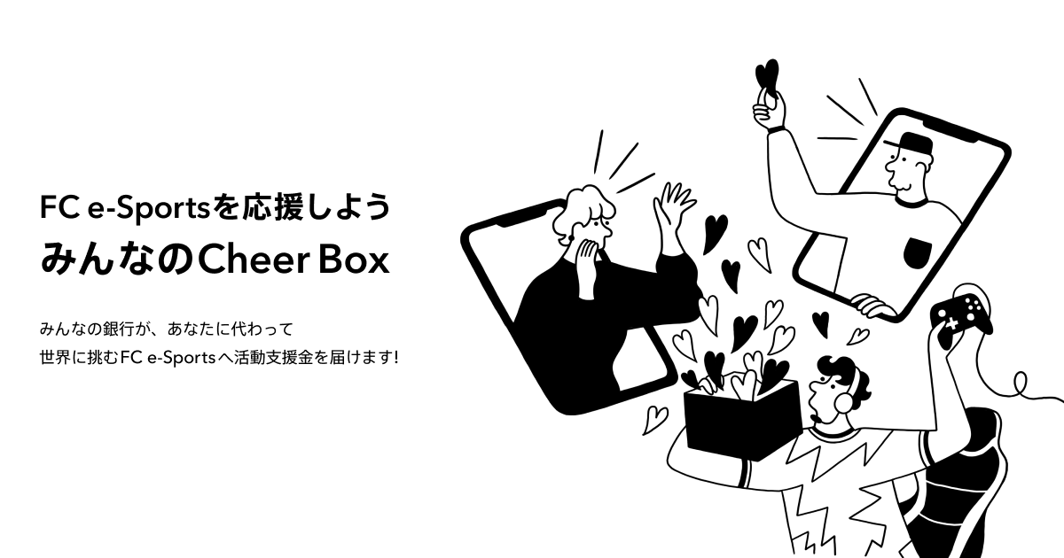 「FCWIN」の5文字を含む名前を付けたCheer Boxにお金を預けていただくことで、みんなの銀行がファンの皆さまに代わって、Cheer Box預金残高の1%を、FC e-Sports にお届けします。