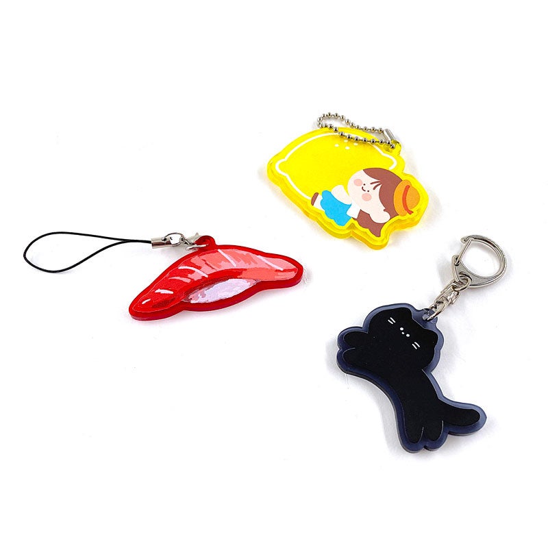 カラーアクキーは自由なカタチでお作り頂けます。自由でオリジナル性の高いアクリルキーホルダーを作りたい方はおすすめです。