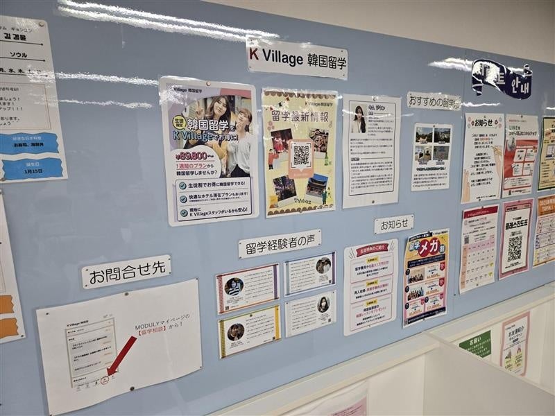 福岡天神校では、K Village韓国留学の紹介スペースも用意し現地への短期・長期留学もサポートしています。