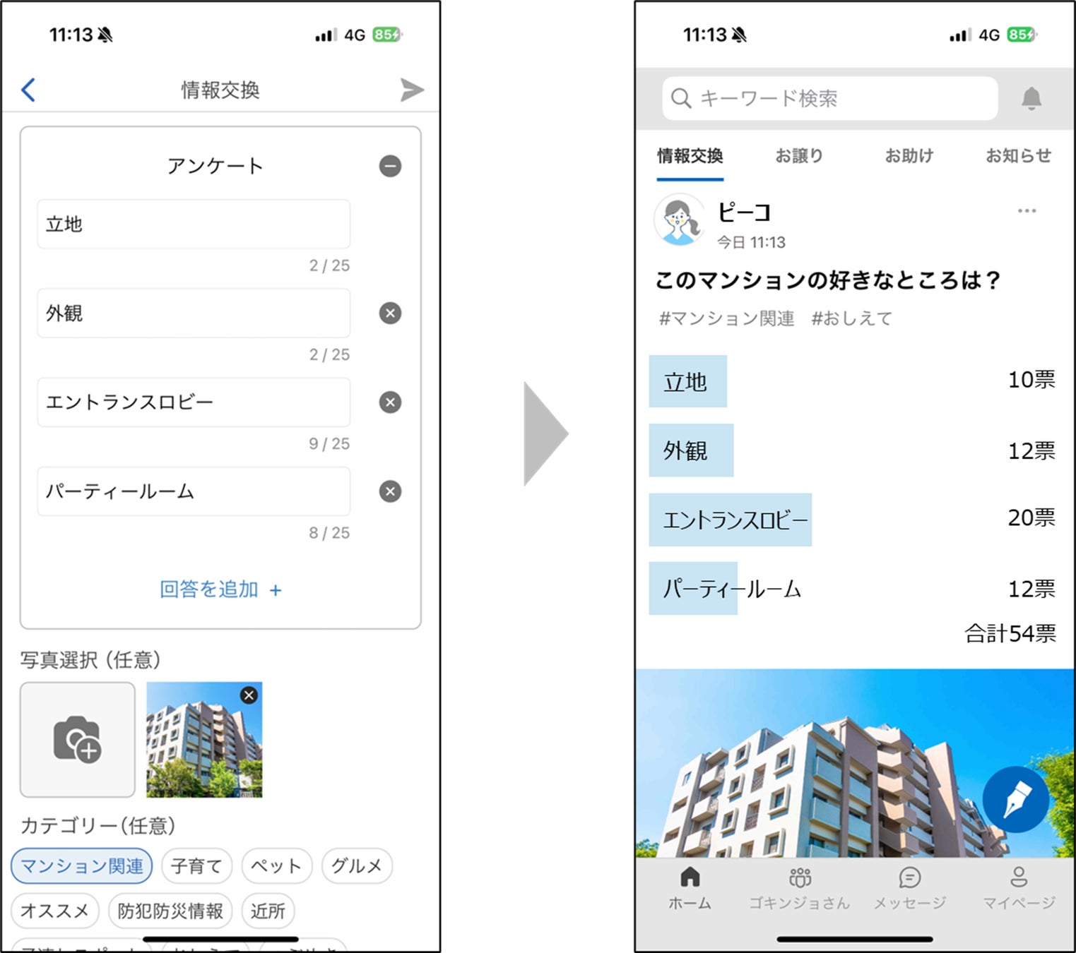 アンケート機能は、GOKINJOアプリ内で簡単に他の居住者の意見等を聞き、アンケート結果を可視化することが出来る機能です。ニックネームまたは匿名を用いて、実名や部屋番号を明かすことなく気軽にお使いいただけます。この機能により、居住者間の意見交換の促進や、コミュニティ活動における意見の収集・集約作業の円滑化、また運営からのアンケート調査の簡易化やタイムリーな意見の取得等を狙いとしています。