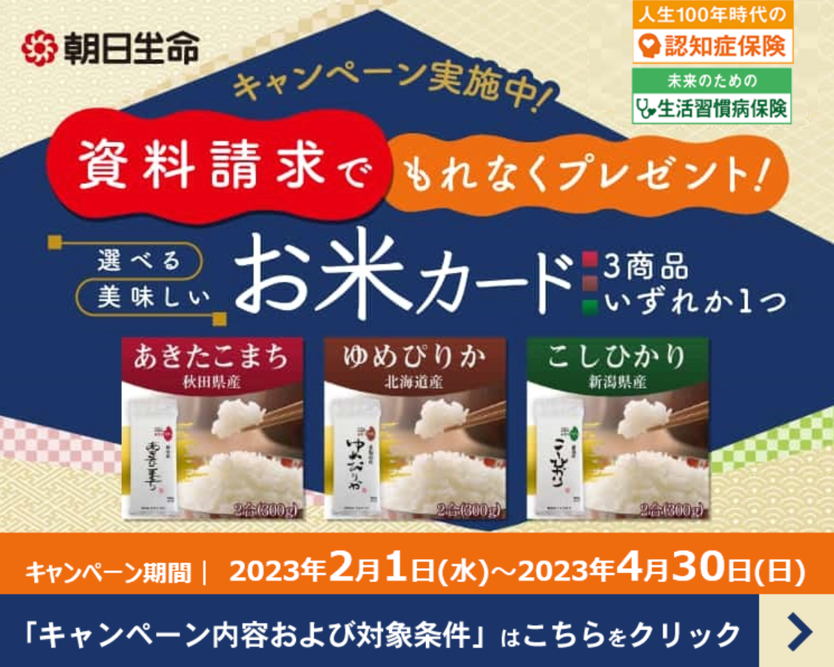 期間中に「人生100年時代の認知症保険」もしくは「未来のための生活習慣病保険」の資料をご請求いただいたお客様に「選べる美味しいお米カード」(対象商品:新潟産「こしひかり」・秋田産「あきたこまち」・北海道産「ゆめぴりか」)をプレゼントします。
