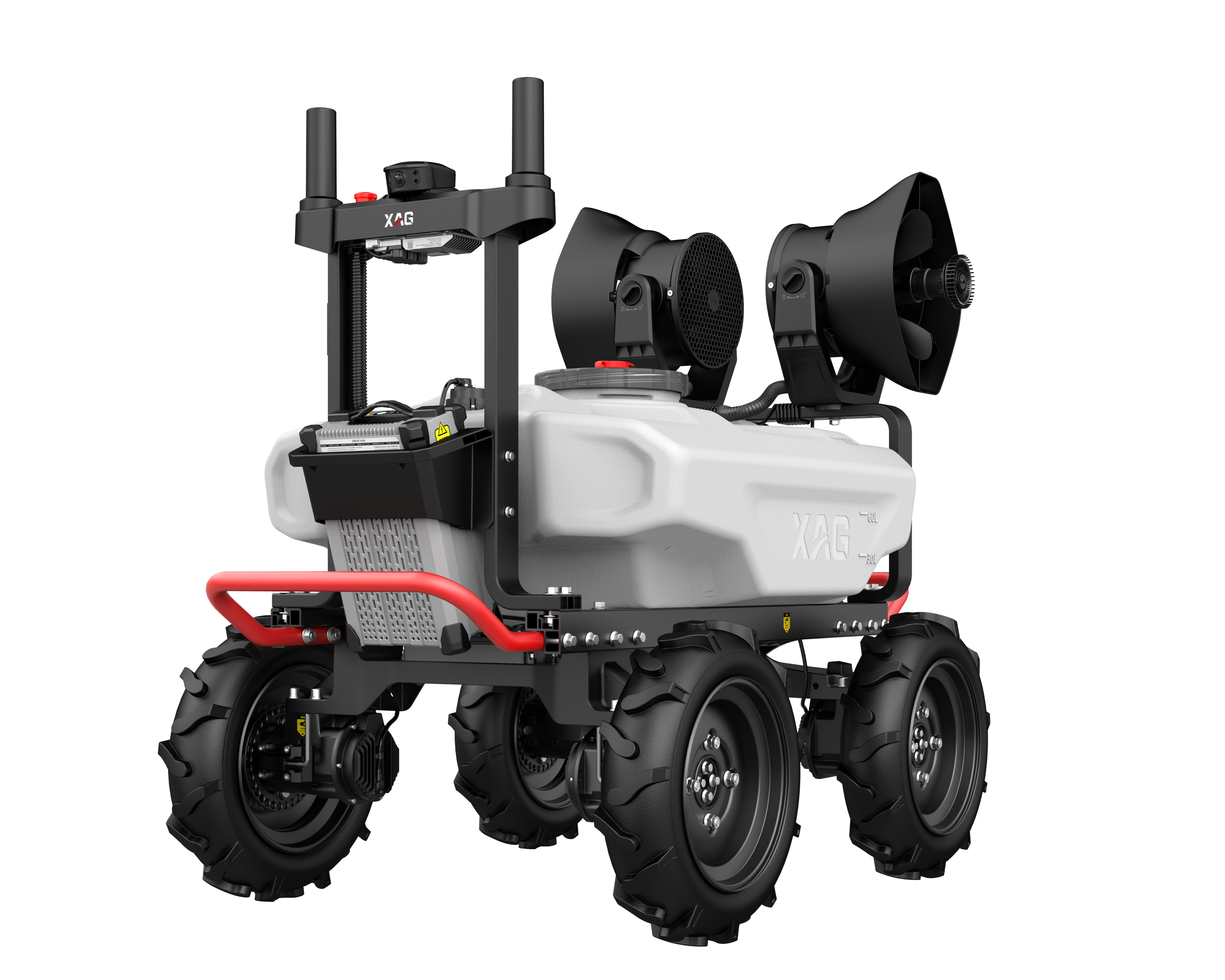 農業用無人車「R100」、「R200」はRTKによる制御で、どなたでも簡単かつ安全に、正確な走行と散布を実現する性能を有しています。車体には軽量、耐久性、安定性を実現するアルミニウム構造を採用し、タンクと散布装置を外すことで収穫物の運搬等にも使用できます。また、高性能モーターと独立モーター駆動システムで強力なオフロードパフォーマンスを発揮し、平地や果樹園等の複雑な地形でも走行でき、最大積載量は4輪駆動の「R100」は126kg、6輪駆動の「R200」は240kgとパワフルです。