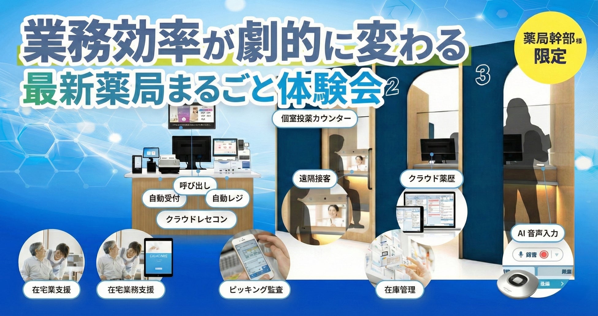 本体験会は、薬局経営者ならびにシステム導入や業務改善を担う薬局幹部を対象とした、少人数・予約制で実施する小規模・高密度型の体験イベントです。業務効率化と患者満足度の両立に向けたポイントを解説するセミナーの開催に加え、受付から会計まで一連の業務をサポートする薬局向けDXサービスや患者のプライバシーに配慮した環境を実際に体験できます。また、薬局DXの導入・活用に関する個別相談も行います。
