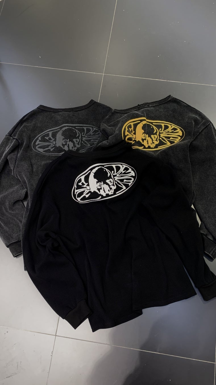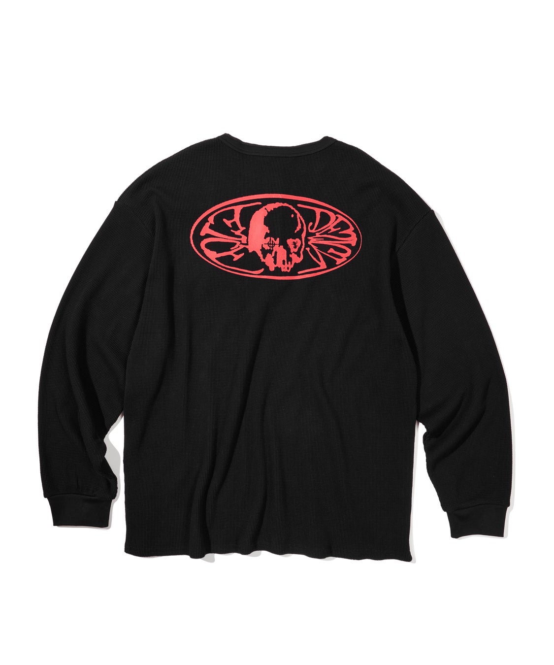 スカルグラフィックがデザインされたワッフル地のニット。
