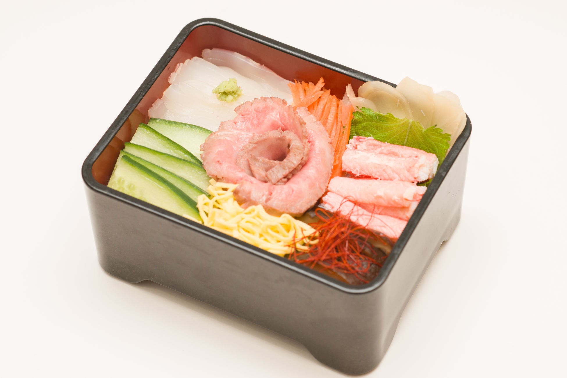 鳥取県オリジナル米「星空舞」の酢飯をキャンバスに自慢のベニズワイガニや鳥取和牛、白いか、しいたけなどカラフルな食材を彩った、華やかな贅沢ちらし寿司です。