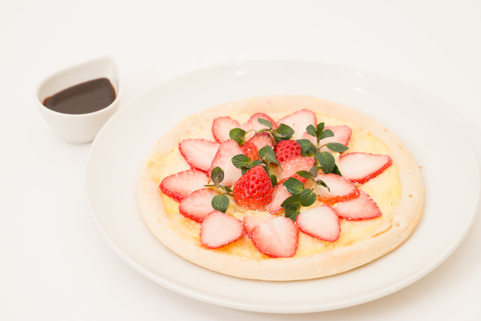 すっきりとした甘味が特徴の鳥取県オリジナル苺「とっておき」を使ったデザートピザ。