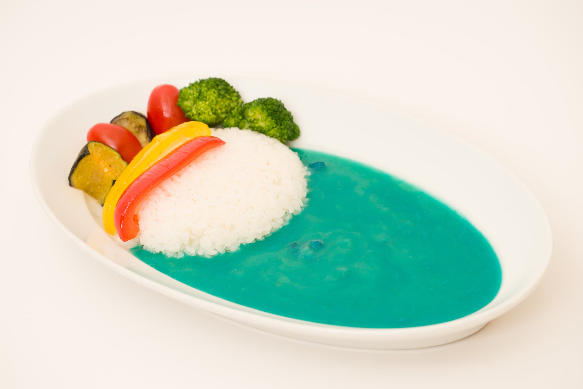 鳥取県の海をイメージした鮮やかな青いルーと鳥取県産ブロッコリーなどのカラフルな野菜を乗せた、ビビッドカラーが目を引く、爽やかな気分になれるカレーです。