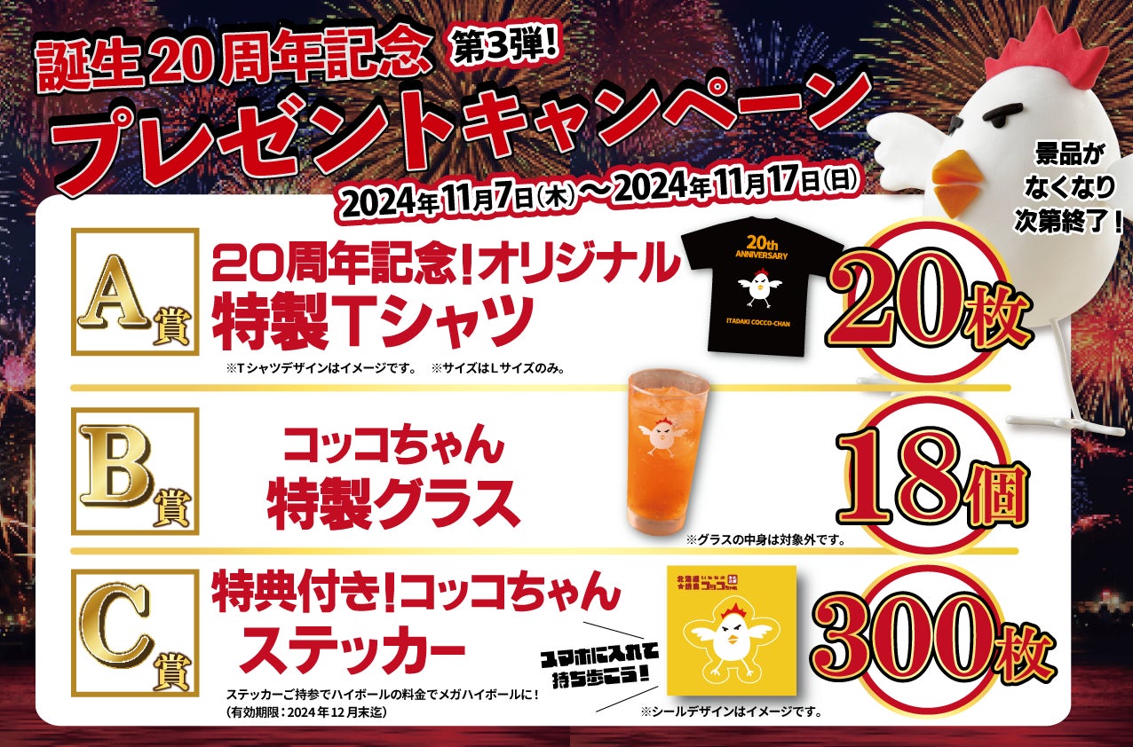 札幌を拠点に東北・関東で「北海道イタリアン ミアボッカ」「北海道小麦の生パスタ 麦と卵」などの飲食店を46店舗展開する株式会社イーストン(本社:北海道札幌市、代表取締役社長 大山泰正)は、焼鳥業態『焼鳥ダイニング いただきコッコちゃん』全店にて2024年11月7日(木)から2024年11月17日(日)の期間、1号店オープン20周年を記念して、お客様への還元キャンペーンのラストを飾る第3弾、プレゼントキャンペーンを開催いたします。