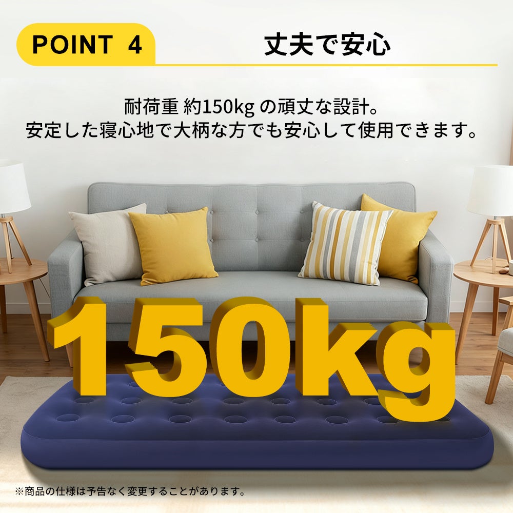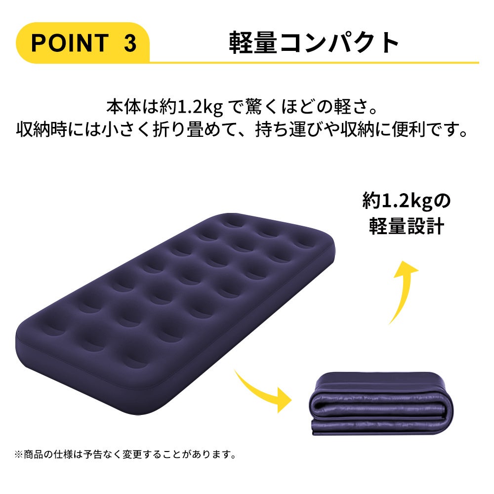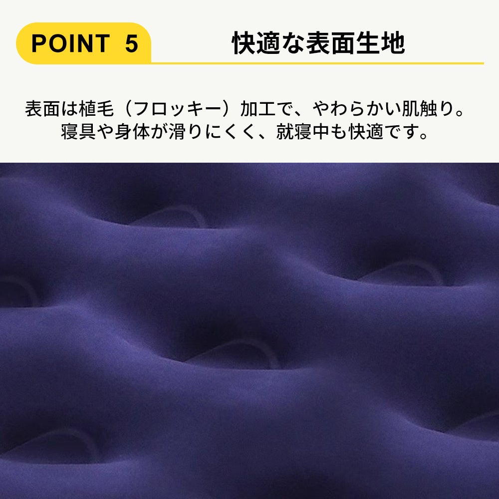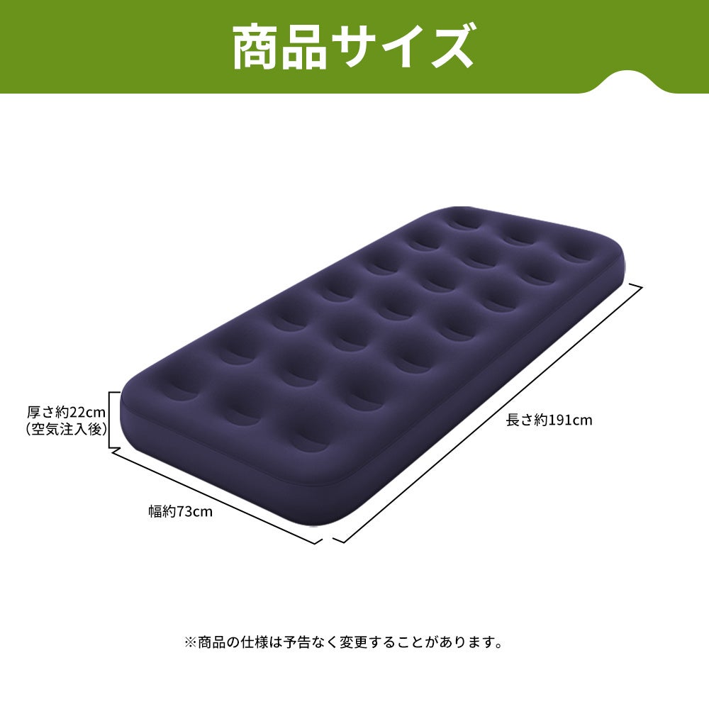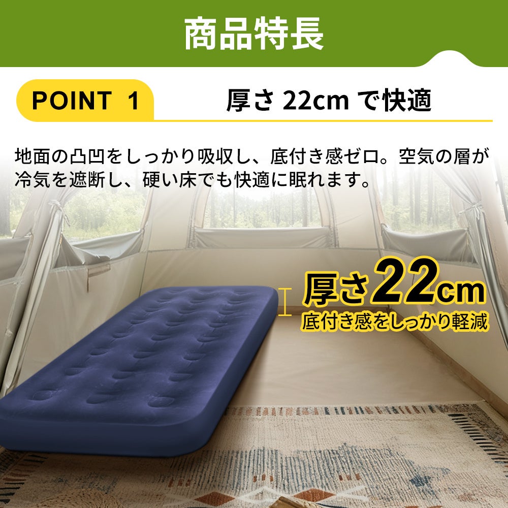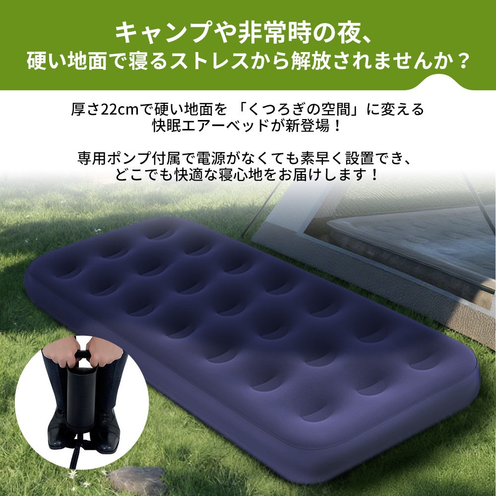 厚さ22cmのエアーベッドが、硬い床や冷えから身体を守ります。電源不要の専用ポンプで素早く膨らみ、すぐに使えます。軽量&コンパクト収納で備蓄や持ち運びに便利なエアーベッドです。