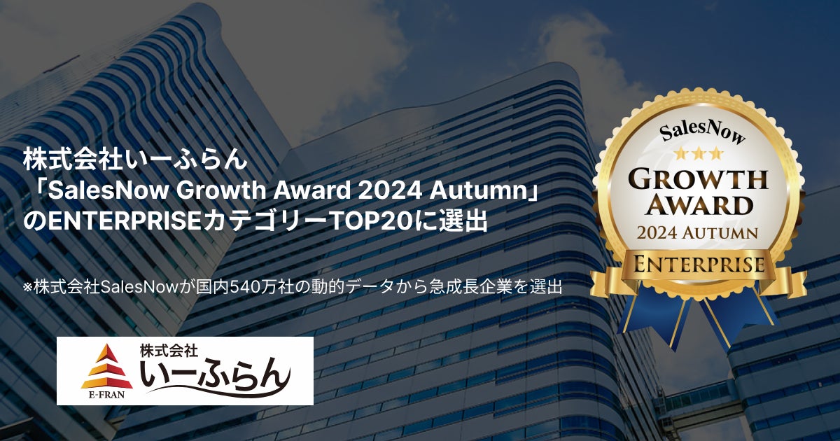 株式会社いーふらん(本社:神奈川県横浜市、代表取締役社長 鹿村大志、以下いーふらん)は、株式会社SalesNowが国内540万社の動的データから急成長企業を選出する「SalesNow Growth Award 2024 Autumn」のENTERPRISEカテゴリーにおいて、数ある企業の中からTOP20に選出されたことをお知らせいたします。