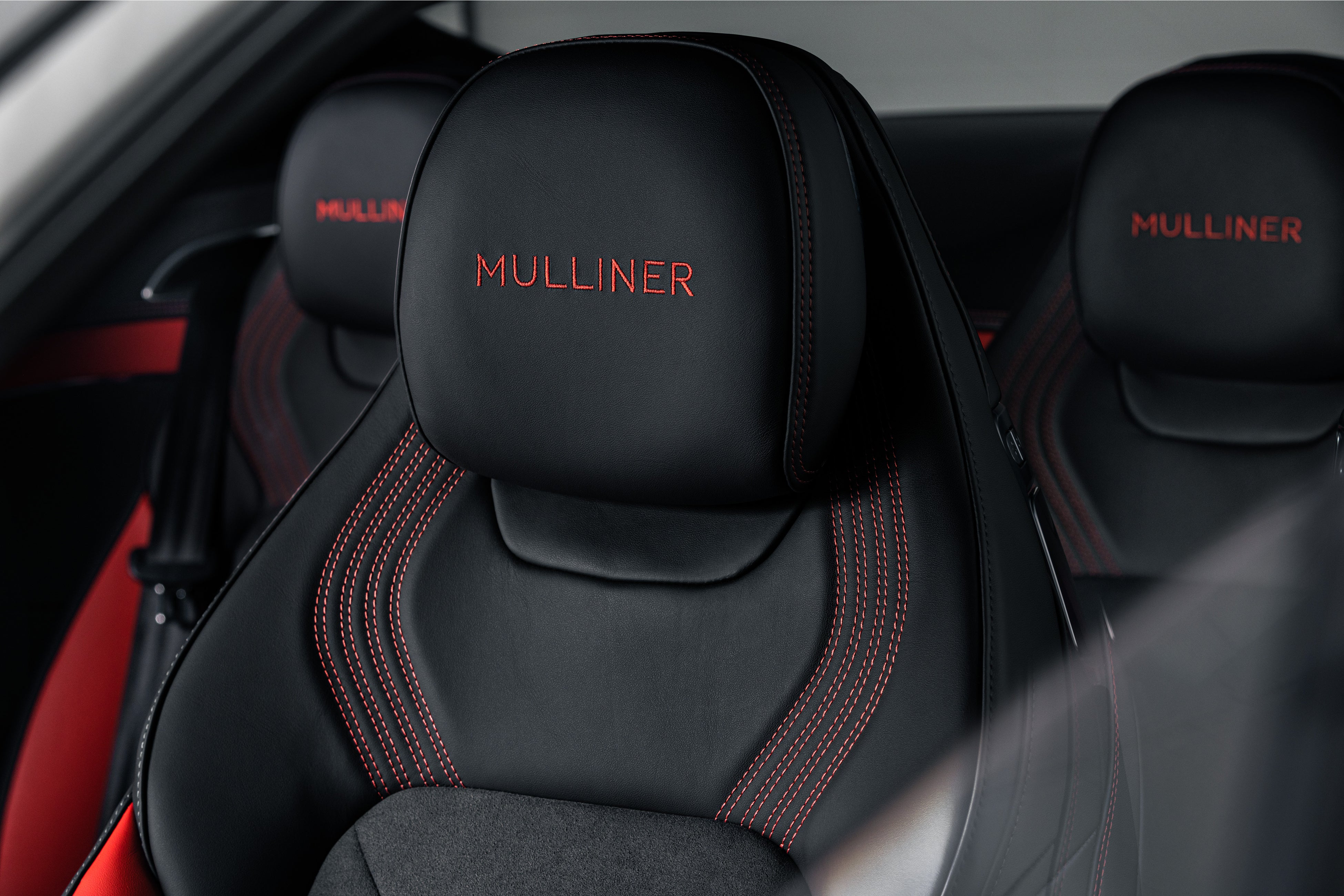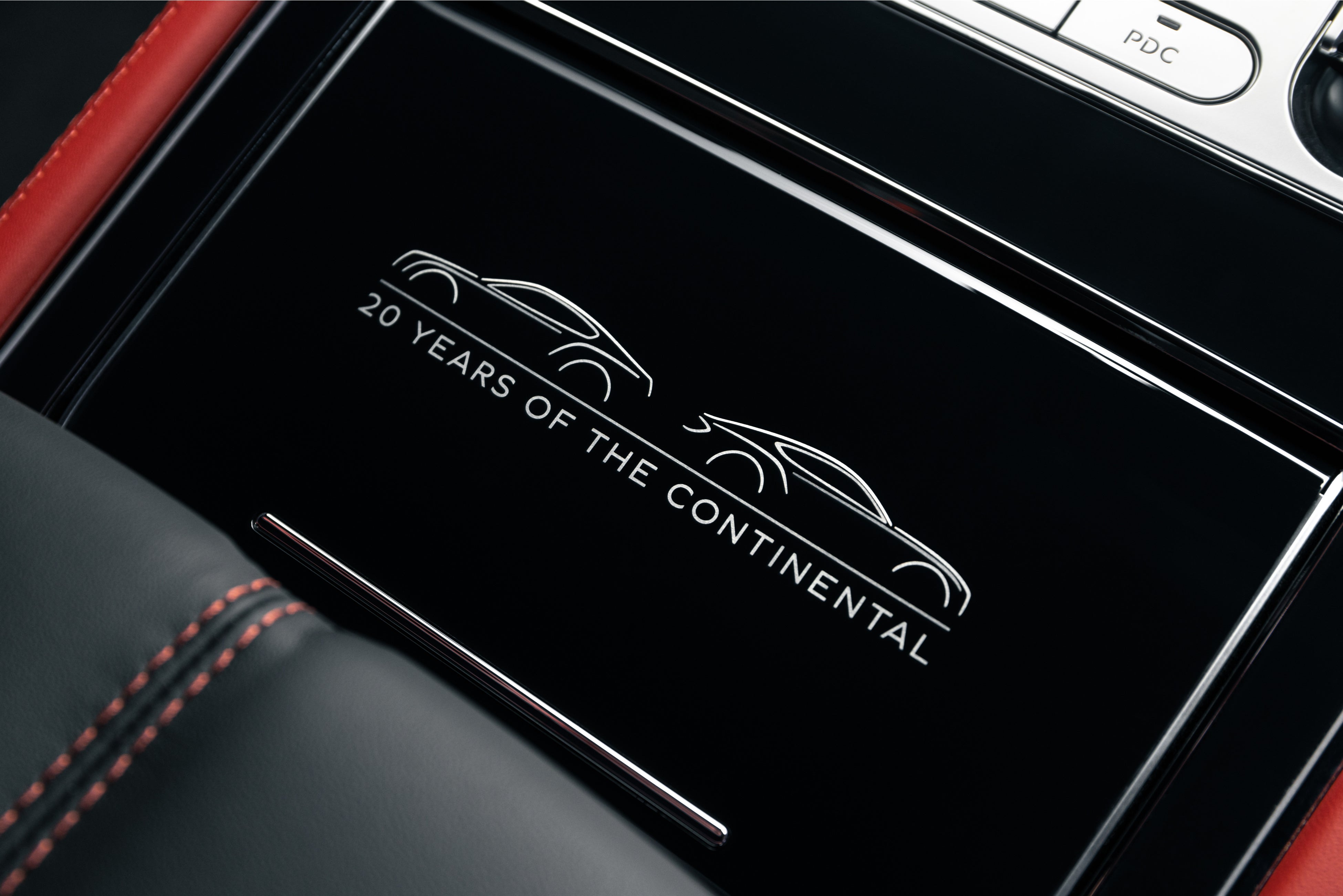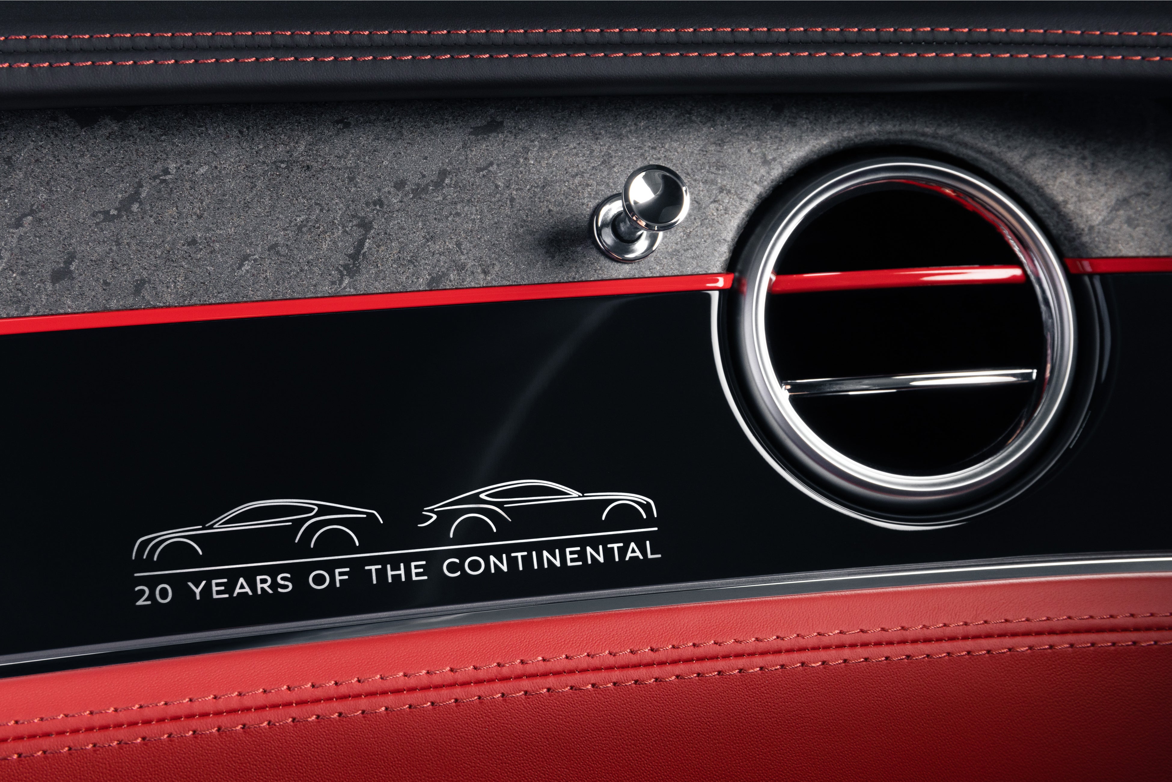 アッパーフェイシアのパネルはグラナイトストーン製で、独特の触感を持つ仕上げとなっています。ロアパネルはグランドブラック製で、コンチネンタル GT誕生20周年を記念したレーザーエッチングオーバーレイが施されています。レッドピンストライプが2つの仕上げを分け、ドアからドアまでフェイシアを横切り、ブルズアイエアベントのアッパーベーンを横切っています。