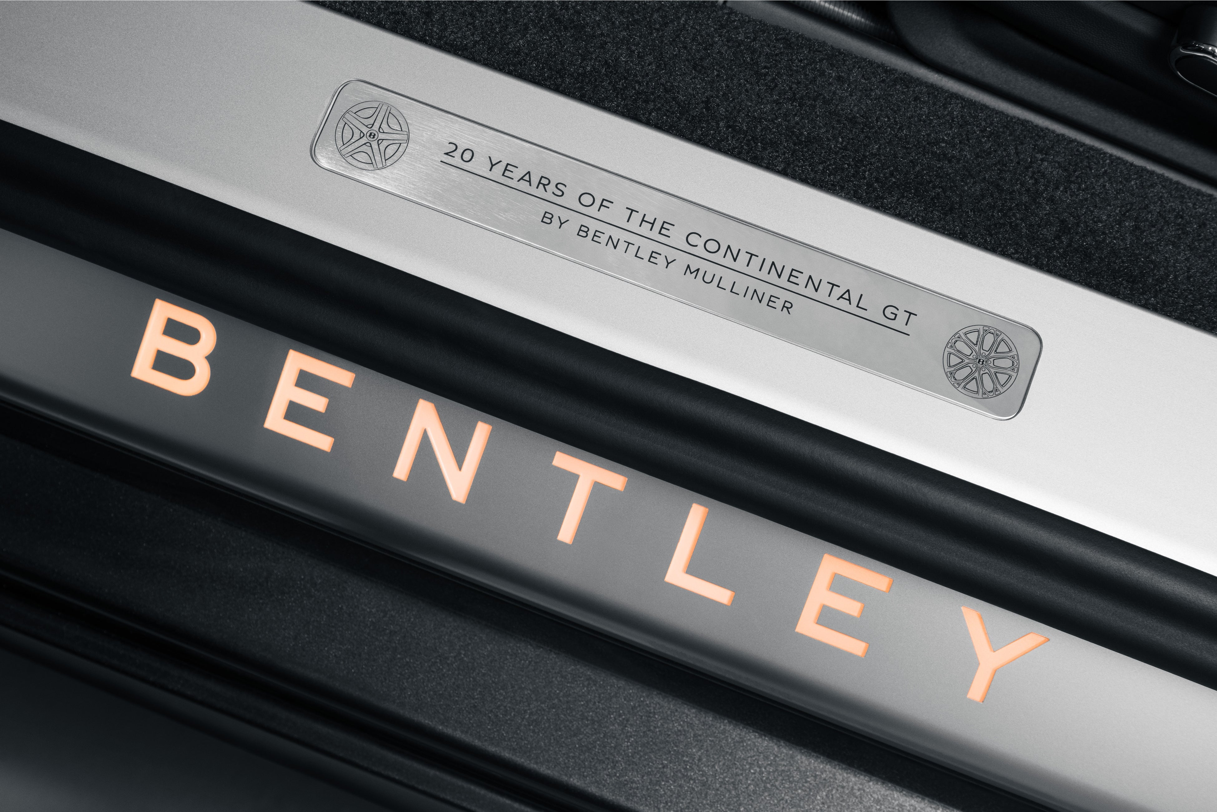 トレッドプレートには、初代コンチネンタル GTと3代目の2つのシルエットが誇らしげに描かれ、モダンGTの20年間を表現しています。センターコンソールにも同じデザインが施され、ドアのLEDウェルカムランプには、このアイコニックなグランドツアラーのアニバーサリーを祝うユニークなデザインが施されています。