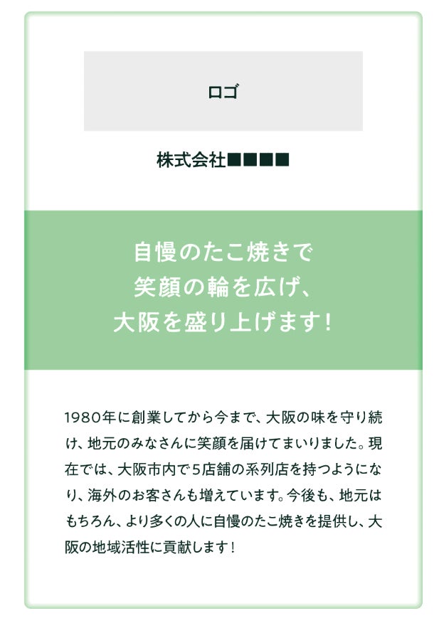 会社名、企業ロゴ、メインメッセージ、詳細説明文の4要素を掲載