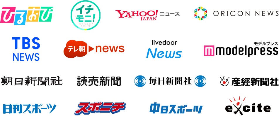 TBS「ひるおび」、HTB「イチモニ!」、YAHOO!ニュース、ORICON NEWS、TBS NEWS、テレ朝 news、livedoor News、モデルプレス、朝日新聞社、読売新聞、毎日新聞社、産経新聞社、日刊スポーツ、スポニチ、中日スポーツ、excite ほか