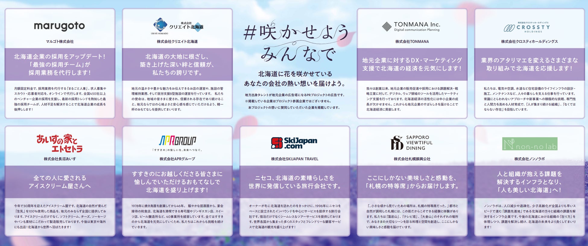 「JAPAN SKETTT. PROJECT」は、「咲かせよう、みんなで」をキャッチコピーに、地方出身タレントがPRでお困りの地元企業さまを支援するプロジェクトです。全国8エリアごとに、地方出身タレントがアンバサダーとなり、地元を盛り上げます。