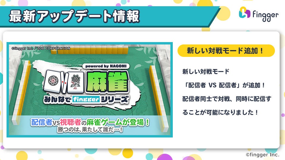 - 12月アップデート『みんなでfinggerシリーズ 麻雀』に同期対戦実装!