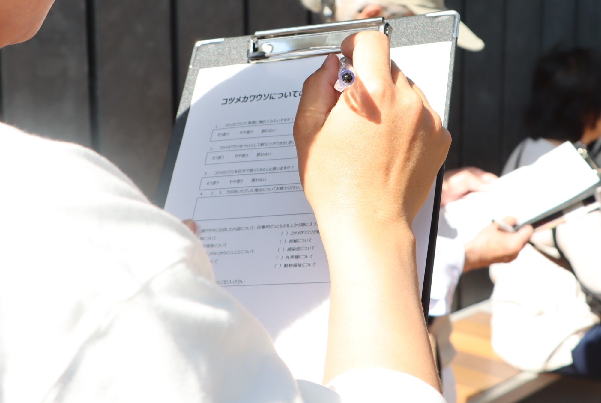 その中では10〜70代の男女のお客様を対象にコツメカワウソをペットとして飼うことに対する意識調査アンケートを、飼育員の話を聞く前と後で実施をしました。