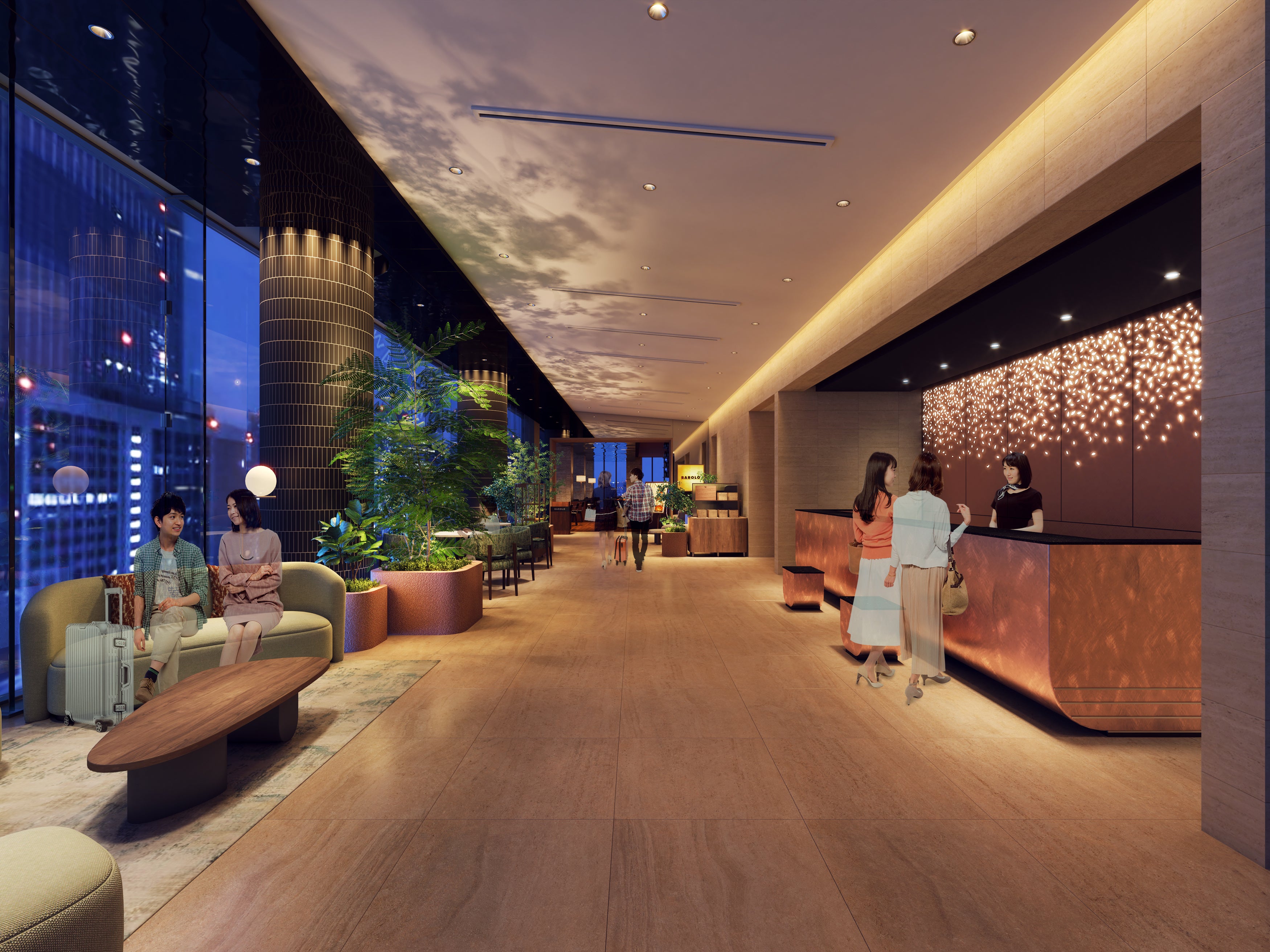 緑と光に包まれリラックスできる空間をデザインし、ご到着時・ご出発時はもちろんのこと、グループ利用時の待合せ等でも便利にお使いいただけるロビーラウンジに生まれ変わります。ごゆっくりお過ごしいただけるよう、どなたでもご利用いただけるコーヒーマシンも設置します。朝昼晩で変わるライティングが緑を照らし、時間帯によってロビーの表情が移ろいます。