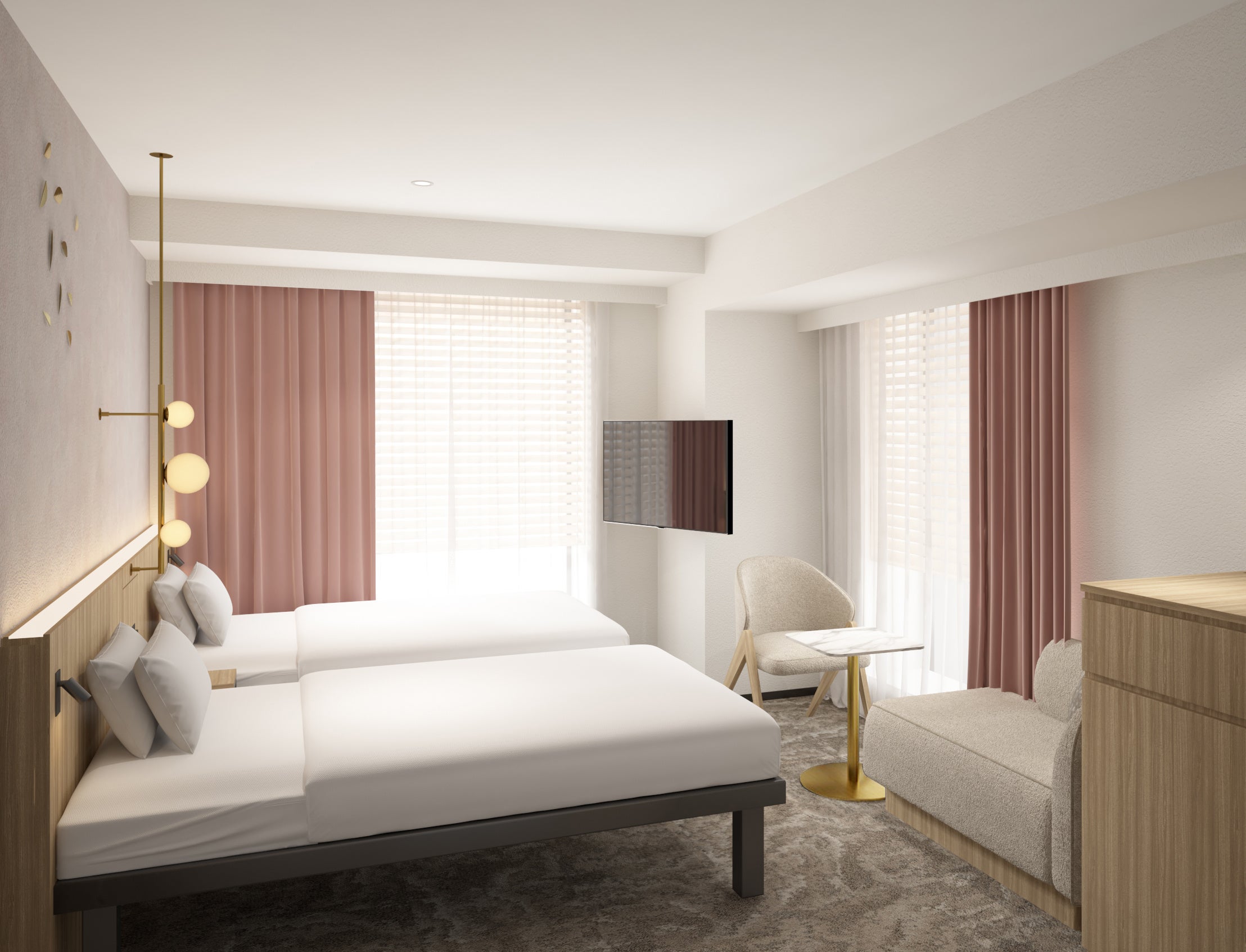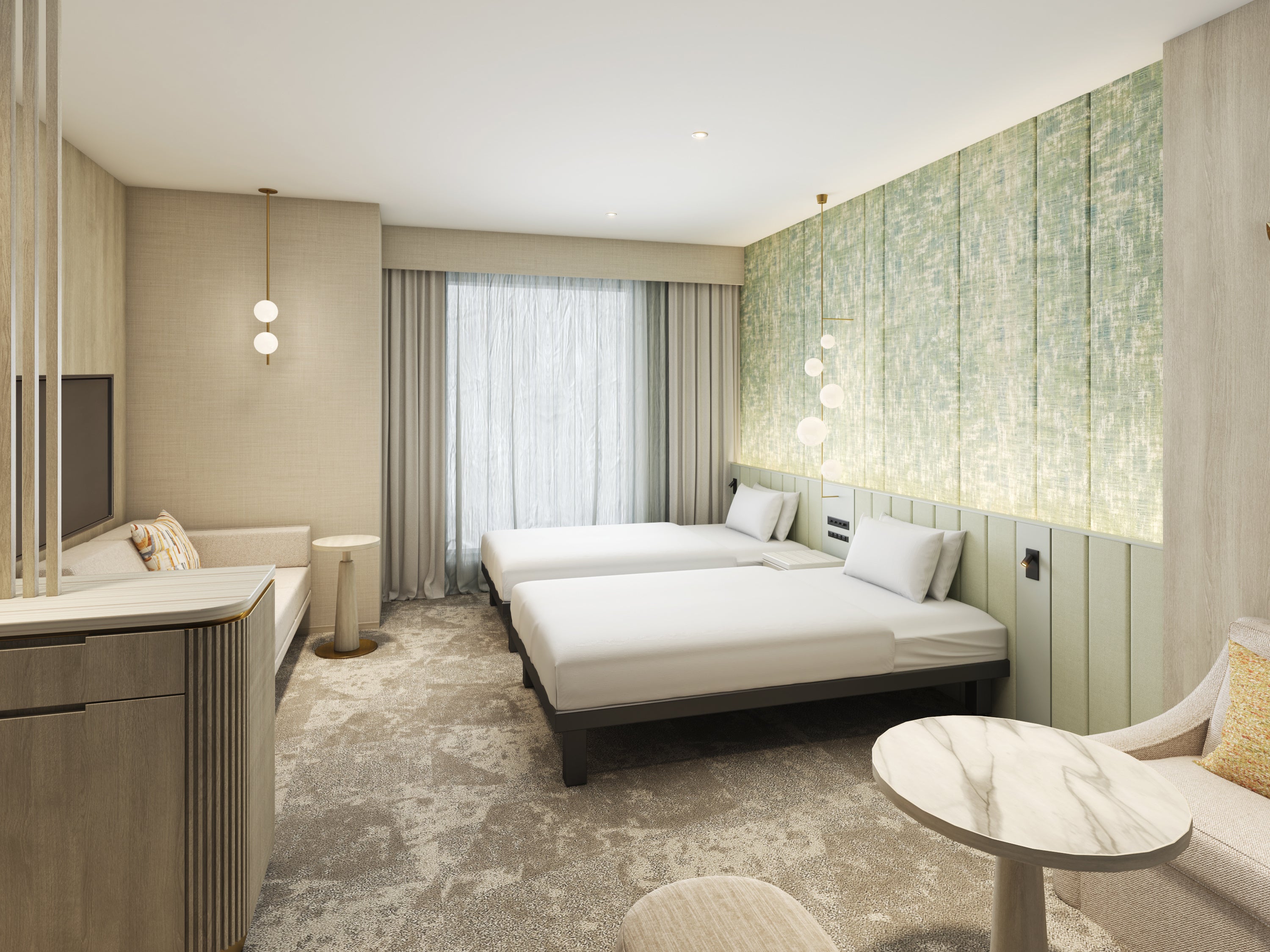友達やファミリーでご利用いただきやすいツイン・トリプルタイプを増設。室内は従前のスタイリッシュで機能性を重視したデザインから、よりくつろぎを感じていただける空間にするために、明るくニュートラルな色調を基本としたデザインに変わります。また、多くの客室では暖かみのある色調を採用していますが、30㎡以上の客室では爽やかな色調を採用し、ご利用シーンによって異なるデザインをお楽しみいただけます。