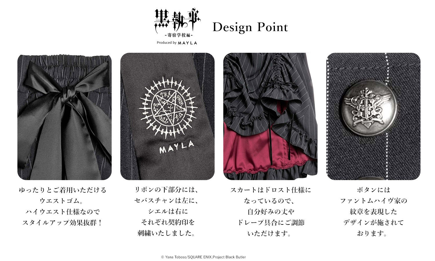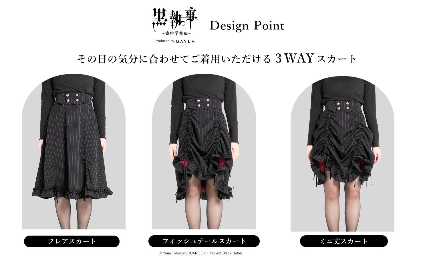 この度、MAYLAは『黒執事 -寄宿学校編-』の世界観をイメージしたアイコニックなスカートを発売いたしました。