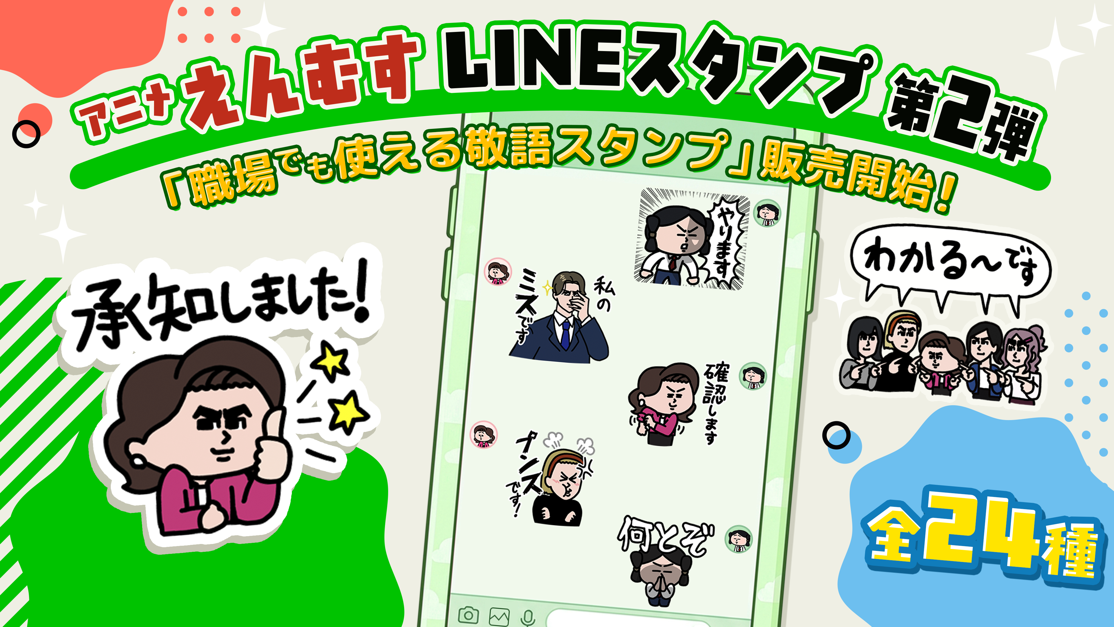 第2弾は「職場でも使える」をテーマに、敬語にフォーカスしたスタンプ24種をラインナップ!