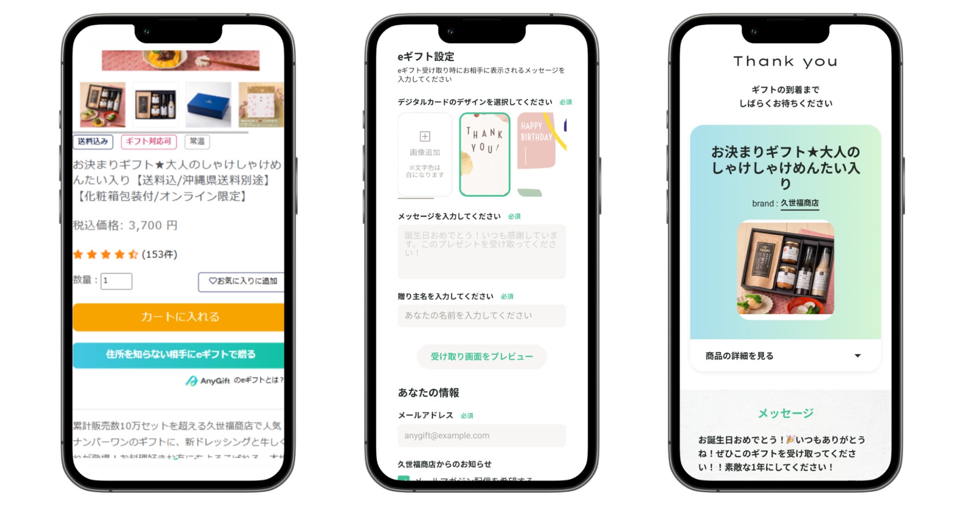 「AnyGift」は、相手の住所を知らなくてもLINEやメールで手軽にギフトを贈ることができるeギフト機能です。